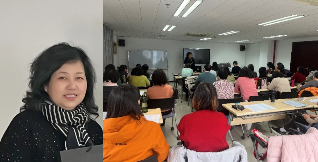 董欣老师代表写作与词汇组发言,结合《文艺复兴艺术作品与圣经故事》、《北京和上海:中国历史上的双城记》、《科技前沿英语》、《分析性写作》、《批判性思维写作》和《实用基础英语写作》等课程的实际和学生能力培养的目标,从中西文化对比、培养学生的思辨能力和引导学生了解中国科技发展所取得的巨大进步等几个方面,探索了将思政元素应用于课堂教学的新思路和新方法。