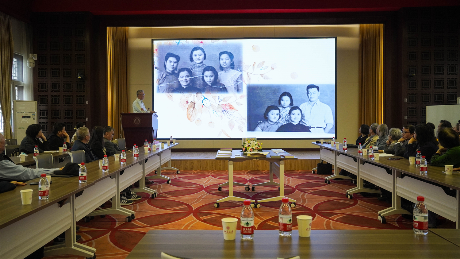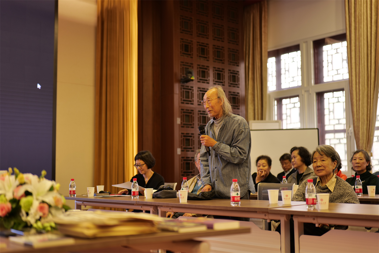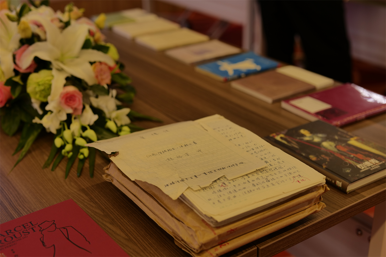 追思会由法语系段映虹教授主持。段老师表示,桂裕芳教授去年12月底辞世,众多师友深感悲痛。如今正值清明时节,法语系举办追思活动,是希望大家能在春意盎然、万物生长的季节团聚于美丽的燕园。桂裕芳教授一生教书育人,她逝去的生命也如同季节的轮回在一代代学生身上延续,在她留下的文字中永生。桂先生的手稿和部分译著样书陈列在会场中央的展示台上,她仿佛在鲜花相伴的墨迹中与我们同在。