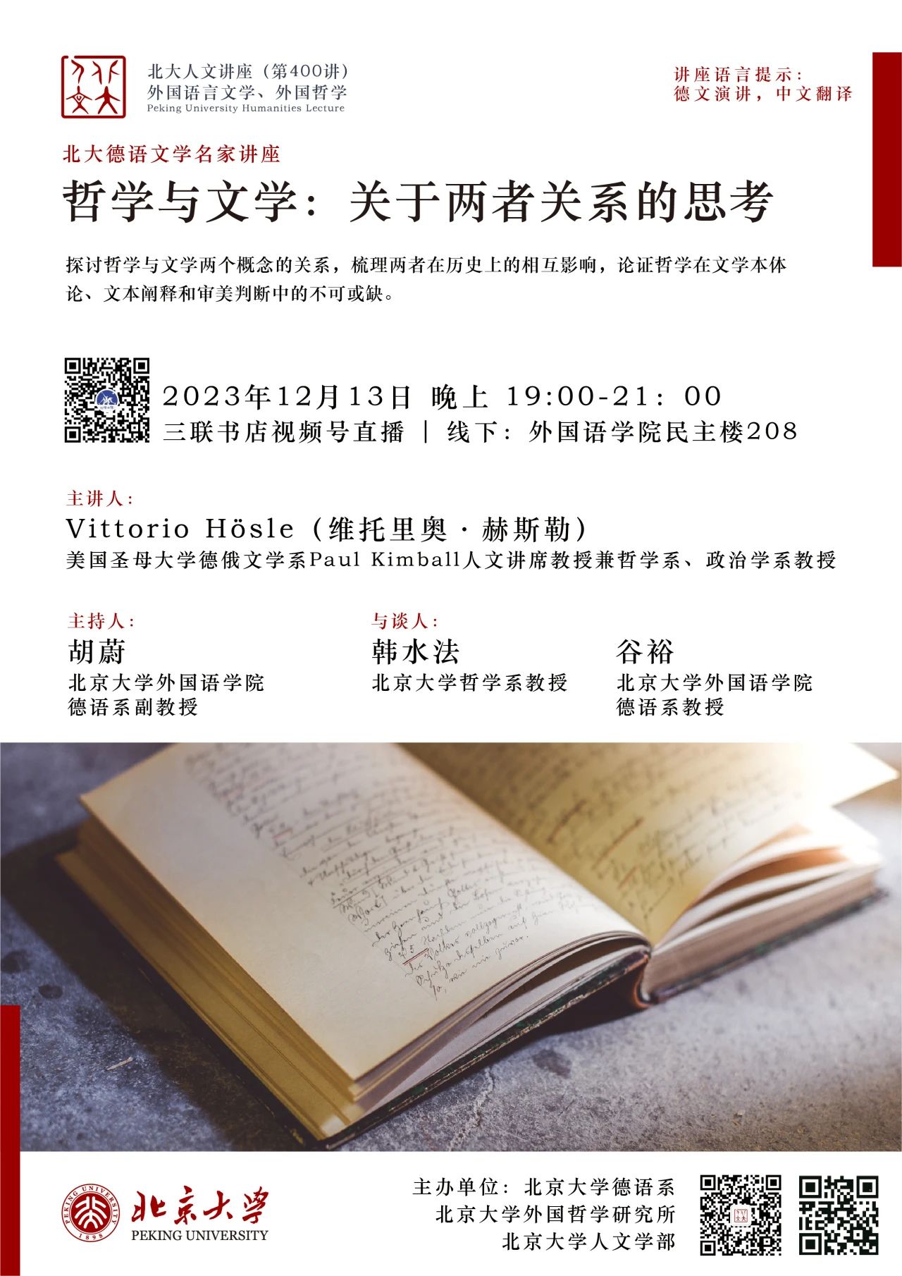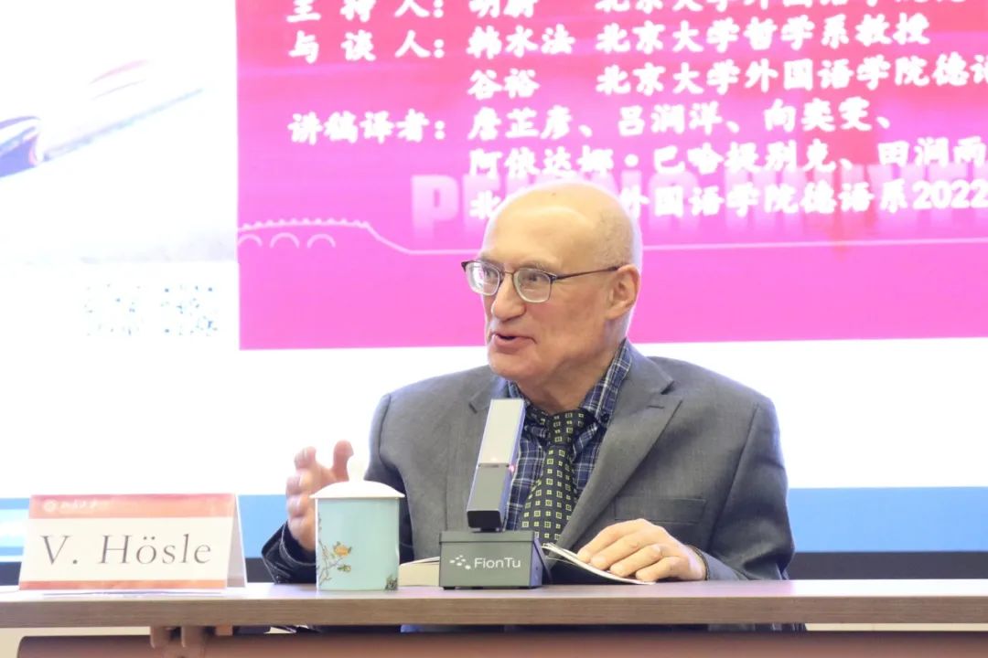 2023年12月13日晚,大雪纷飞,应乐鱼·体育德语系邀请,美国圣母大学Paul Kimball人文讲席教授(兼任德语系、哲学系、政治学系教授)、圣母大学人文高等研究院创始院长赫斯勒(Vittorio Hösle)教授在民主楼208会议室做题为“哲学与文学:关于两者关系的思考”的精彩主题报告。该讲座由乐鱼·体育德语系主任胡蔚副教授担任主持,哲学系韩水法教授、德语系谷裕教授担任与谈人,德语系黄超然助理教授担任现场交替传译。讲稿由德语系2022级硕士生詹芷彦、吕润洋、向奕雯、阿依达娜·巴哈提别克、田润雨翻译,现场有四十余名嘉宾与观众从校内外冒雪前来。本次活动由乐鱼·体育德语系、北京大学外国哲学研究所和北京大学人文学部联合主办,由三联书店视频号全程直播,共计有6700多人次收看。