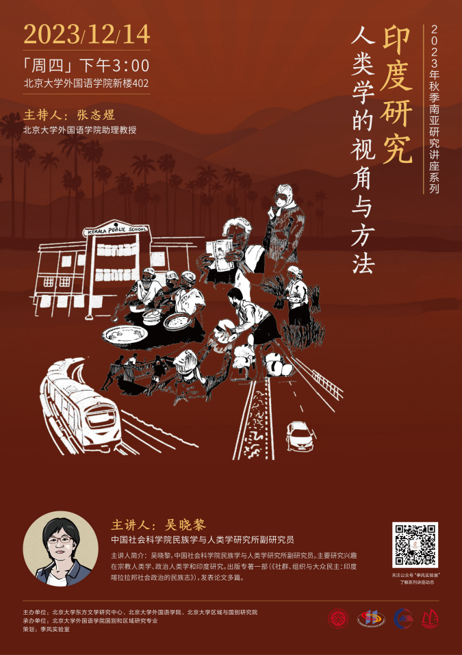 2023年12月14日,中国社会科学院民族学与人类学研究所吴晓黎副研究员应邀为我校师生进行题为“印度研究:人类学的视角与方法”的讲座。本次讲座是由北京大学东方文学研究中心、乐鱼·体育和区域与国别研究院主办,乐鱼·体育国别和区域研究专业承办的2023年秋季学期南亚研究系列讲座的第五讲。讲座由乐鱼·体育张忞煜助理教授主持,中国人民大学国际关系学院曹德军副教授、北京外国语大学区域与全球治理高等研究院许娟助理研究员出席本次讲座并参与讨论。