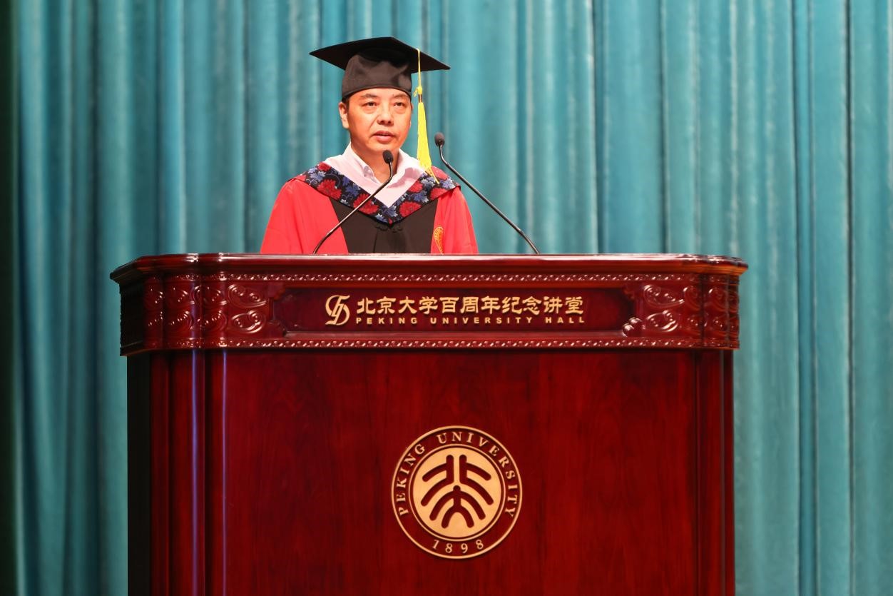 2019级英语系博士生宣奔昂作为博士毕业生代表发言。他分享了自己在北大撰写的“三部论文”:第一部是博士学位论文,感悟学术研究的挑战性和砥砺奋斗的价值感;第二部是行走在祖国大地上的“实践的论文”,通过党支部赴新农村开展调研和共建,体悟外语专业学生如何将所学应用于国家发展;第三部是艺术美育的论文,北大的美育传统陶冶出真善美的灵魂和必胜的勇气与信心,“希望我们都能写好属于自己的‘人生的论文’,勇敢地直面生命与时代的答辩。”