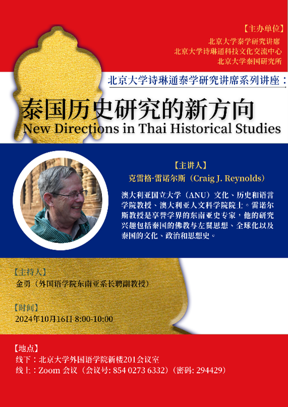 2024年10月16日和10月23日,应北京大学诗琳通泰学研究讲席和北京大学诗琳通科技文化交流中心邀请,著名东南亚史和泰国史学者克雷格·雷诺尔斯(Craig J. Reynolds)教授为北京大学师生进行了两场泰国史研究的线上学术讲座。讲座采取线上线下融合的方式,线下会场设于乐鱼·体育新楼201会议室。本次系列讲座也是“北京大学诗琳通泰学研究讲席系列讲座”的一部分。
