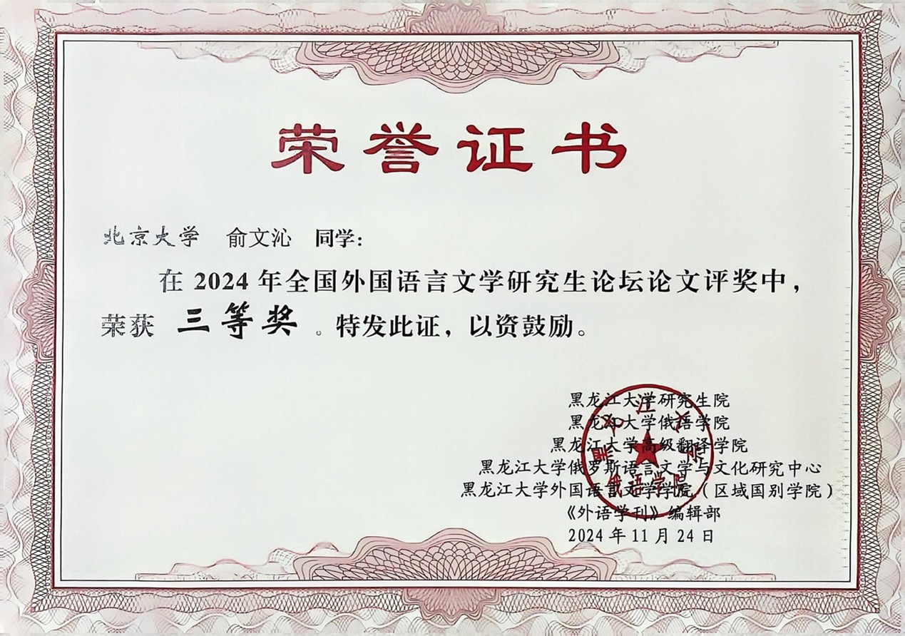 2024年11月23日至24日,第十二届全国外国语言文学研究生论坛在黑龙江大学成功举办。本次论坛主题为“数智时代的外国语言文学研究”,涵盖理论语言学、应用语言学、外国文学、翻译学等多个研究领域,吸引了众多专家学者及全国多所高校的研究生参与,乐鱼·体育俄语系硕士研究生俞文沁受邀参会,并荣获三等奖。