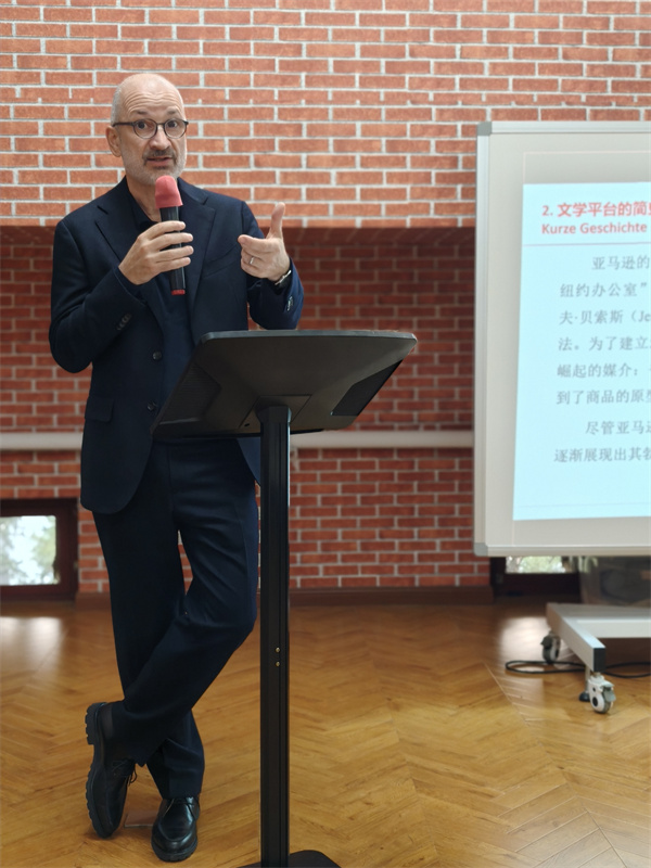 11月8日,第三场“数字资本主义时代的文学:以电商平台Amazon为例”在民主楼301室举行,马尔图斯教授主讲,德语系助理教授、副主任毛明超主持。马尔图斯教授首先回顾了上世纪末数字化浪潮带来的公共空间转型,以及数字资本主义所带来的新挑战:平台成为市场本身。在具体实践中,数字化监控、绩效等手段被纳入文学生产。随后,马尔图斯教授聚焦德国当代文学中“社会自传”(Autosoziobiographie)及其中的“第一人称文学政治”,即通过讲述异化批判资本主义社会中的不平等。但同时也引发了社会“怨气”(Ressentiment)的累积。在数字资本主义时代,“怨气”最终可能被工具化为政治煽动的道具。因此,有必要重思当下文学作为自我表达的途径与价值。观众就同好社群的建立、开放平台与同质化等与马尔图斯教授进行了深入探讨。至此,“今日经典”系列讲座圆满结束。