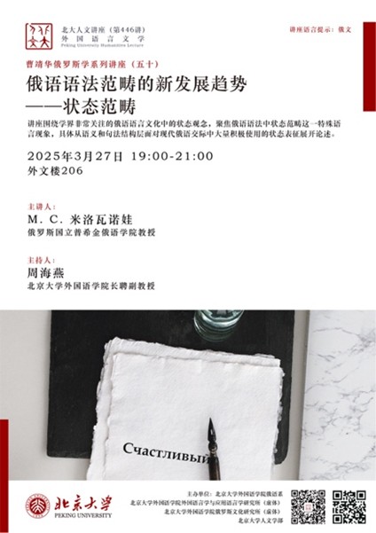 2025年3月27日晚,俄罗斯国立普希金俄语学院知名语言学家玛·斯·米洛瓦诺娃教授(М.С. Милованова)应乐鱼·体育邀请,于外文楼206会议室主讲“曹靖华俄罗斯学系列讲座”第50讲。本次学术活动以“俄语语法范畴的新发展趋势——状态范畴”为主题,由乐鱼·体育俄语系、外国语言学及应用语言学研究所(虚体)及俄罗斯文化研究所(虚体)联合主办,俄语系主任周海燕长聘副教授担任主持,俄语系教师、博士后、硕博研究生以及本科生参加讲座活动。