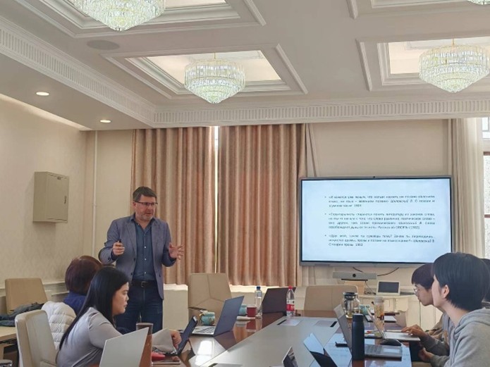 在交流环节,与会师生就俄国传统语言观、索绪尔语言学、逻各斯中心主义等话题向加里宁研究员请教,加里宁研究员一一作答。
