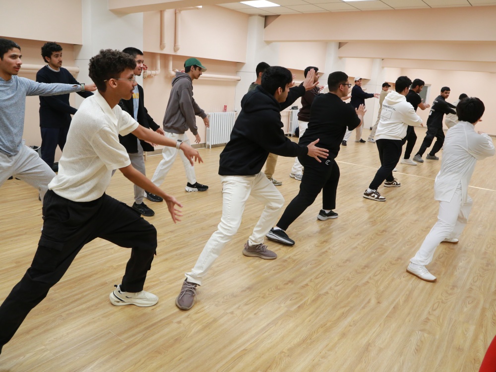 代表团男生体验太极运动