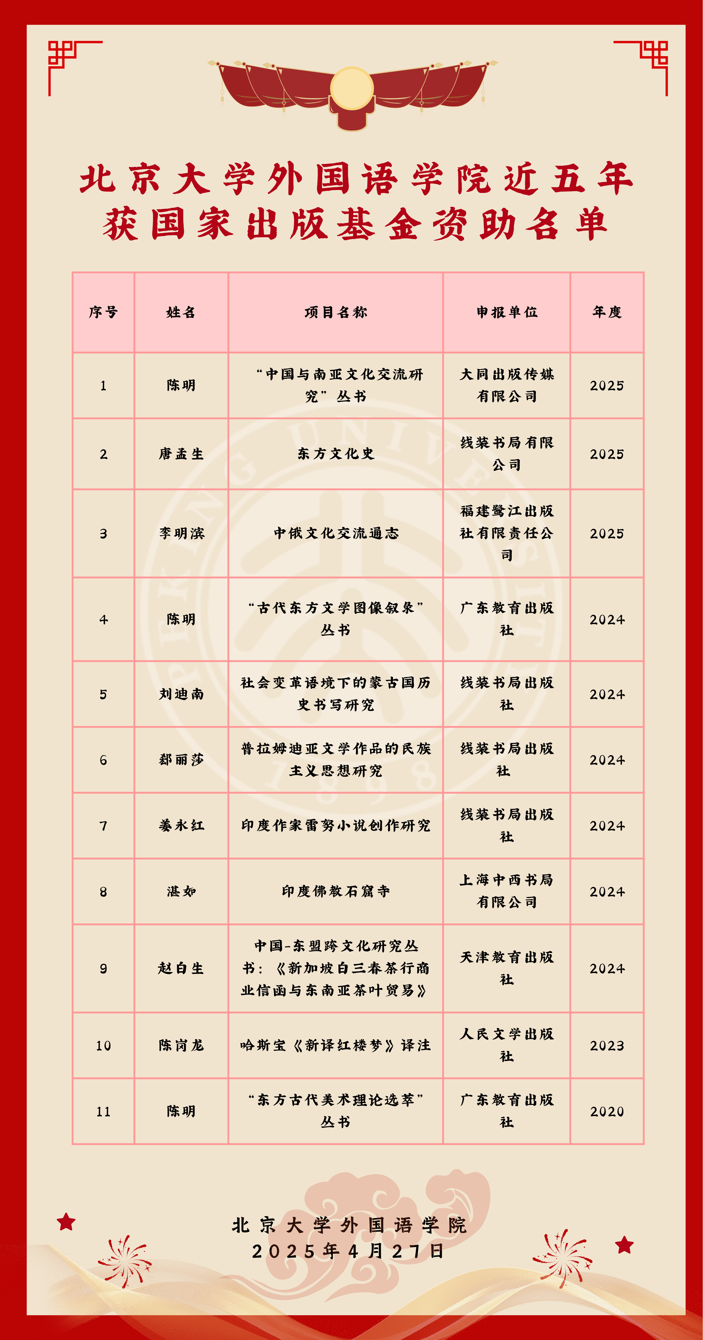 学院有三项成果入选2025年度国家出版基金资助项目名单,包括:南亚学系陈明教授主持的《中国与南亚文化交流研究丛书》、俄语系李明滨教授主持的《中俄文化交流通志》和南亚学系唐孟生教授主持的《东方文化史》。