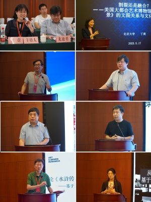第一场论坛由《江海学刊》编辑部主任刘蔚研究员主持,杨剑龙教授评议。北京大学丁莉教授以《割裂还是融合?——美国大都会艺术博物馆藏〈源氏八景〉的文图关系与文化意涵》为题,通过分析《源氏八景》与《源氏物语》割裂的图文关系,阐释了在日本古代“和”与“汉”的文化碰撞和融合中孕育出的新艺术表达。南京师范大学于德山教授以《万物皆屏与无屏之视:新媒体视觉界面演化与观图模式转型》为题,从移动虚拟凝视、浏览式观看、多屏观看三个方面,探究新媒体视域下视觉后现代性的表征。东南大学龙迪勇教授以《时间与媒介——文学叙事与图像叙事差异论析》为题,考察叙事时间中的“时序”及其媒介表征,并在此基础上分析文学与图像叙事的差异,凸显了时间规律在图像叙事和小说叙事的不同地位。南开大学李玉平老师以《论文图二分之不可能性》为题,通过比较非义素书写、视觉诗和语义诗,引入记谱理论,旨在批判超越文图的二元对立模式。