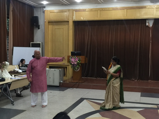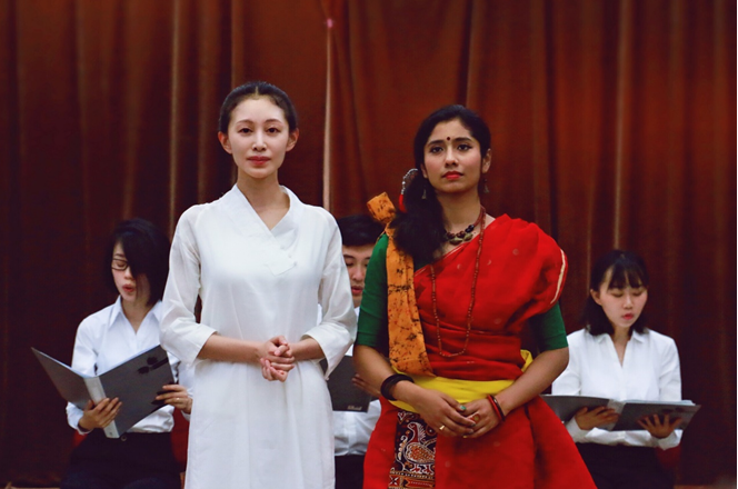 毕业于北京大学印地语专业的校友,中国的印度舞蹈专家金珊珊女士介绍了她编导泰戈尔《齐德拉》音乐舞蹈史诗剧的经验,并和她的学生们展现了古典印度舞蹈之美。印度国际大学乐鱼·体育院长阿维杰特•森教授(Prof. Abhijit Sen)在他有关泰戈尔戏剧发展史的学术报告中,邀请国际大学艺术家高什夫妇( Avik Ghosh/Ms. Gargi Ghosh)呈现了六部泰戈尔经典戏剧的精彩片段。孟加拉国77岁的资深艺术家阿达乌尔•拉赫曼(Mr. Ataur Rahman)为大会做了“孟加拉国泰戈尔戏剧演出史”的精彩大会发言,并与印度艺术家咖尔吉•高什(Ms. Gargi Ghosh)表演了泰戈尔《红夹竹桃》的精彩片段。《红夹竹桃》是泰戈尔最有代表性的戏剧作品之一,本次演出是该剧在中国的首演,演出剧本改编自北京大学资深教授刘安武先生的译本,北京大学 “泰戈尔导读”课程团队参与组织,北京大学六位学子和玺莹仁剧团联合六位国际友人,插入多语种朗诵片段。与会者认为演出独具特色,创新性地表现了《红夹竹桃》的意义。