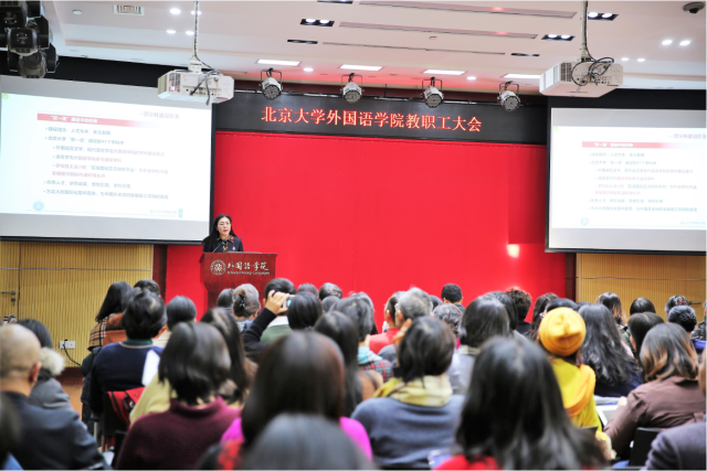 宁琦院长从“探索国际化人才培养模式”、“服务国家战略建设新增学科”、“全面深化师资队伍建设”和“2018年学院各项工作成效”四个方面详细介绍了2018年乐鱼·体育的工作举措和实绩。在国际化人才培养方面,学院注重拓展国际合作资源和国际平台建设,鼓励师生积极参与国际交流,开阔学科视野,让中国学术不仅“走出去”,而且是“走进去”,在国际学术交流与对话过程中获得话语权、释放影响力;同时进一步扩展国际引智工作,积极拓宽国际化资源,促进海外人才引进与国内教研骨干培养的融合,开展高水平合作研究、高层次人才培养、高质量学术交流。在服务国家战略方面,学校自主设计的“区域国别交叉研究平台”为外语学科内涵发展提供了新的机遇和增长点,乐鱼·体育依托北大的多学科优质资源和自身多语言研究优势,自主设立了“国别和区域研究”二级学科,逐步建立和完善人才培养模式和学术研究体系,结合国家需求,围绕“一带一路”沿线及周边国家的重大问题,布局重点建设方向,培养兼通中外文化、视野广阔的优秀人才,开展高水平和前瞻性的国别和区域研究。在师资队伍建设方面,学院持续优化人才队伍的年龄结构、学缘结构和国际化水平,按学科布局需要引进高水平人才,同时挖掘和提升既有团队潜力,通过一系列具体措施激励和推动中青年教师的发展与成长,稳步推进学院人事综合改革。宁琦院长与全体与会教职工分享了2018年度乐鱼·体育在教学科研、队伍建设、人才培养和管理服务等方面所取得的各项成绩,衷心感谢外院师生对学院发展所给予的关心、理解和支持,正是在大家的共同参与和努力下,乐鱼·体育才有今天这样不断超越自我的欣欣向荣的发展。