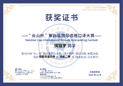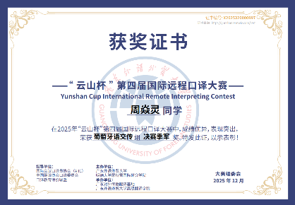 12月20日,第四届“云山杯”国际远程口译大赛总决赛在广东外语外贸大学圆满落幕。北京大学葡语专业大四学生周焱灵在同声传译项目中荣获一等奖(第一名),并在交替传译项目中获得季军;同为大四的佴铭宇在交替传译项目中获得二等奖。两位同学在紧张的竞赛环境中稳定输出、准确传达,展现了良好的临场反应、信息整合与专业表达能力。