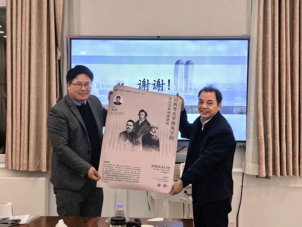 2025年11月19日晚,由北京大学东方文学研究中心和乐鱼·体育主办的北京大学“语藏计划”系列讲座第3讲在外文楼206成功举办。本次讲座邀请复旦大学外国语言文学学院院长高永伟教授做了题为“词典考古学视角下的英汉汉英词典研究”的报告。讲座由乐鱼·体育外国语言学及应用语言学研究所副所长冯硕老师主持,所长胡旭辉老师担任评议人。乐鱼·体育院长陈明老师、副院长吴杰伟老师、日语系孙建军老师和南亚学系张幸老师以及外院的学生到场聆听。