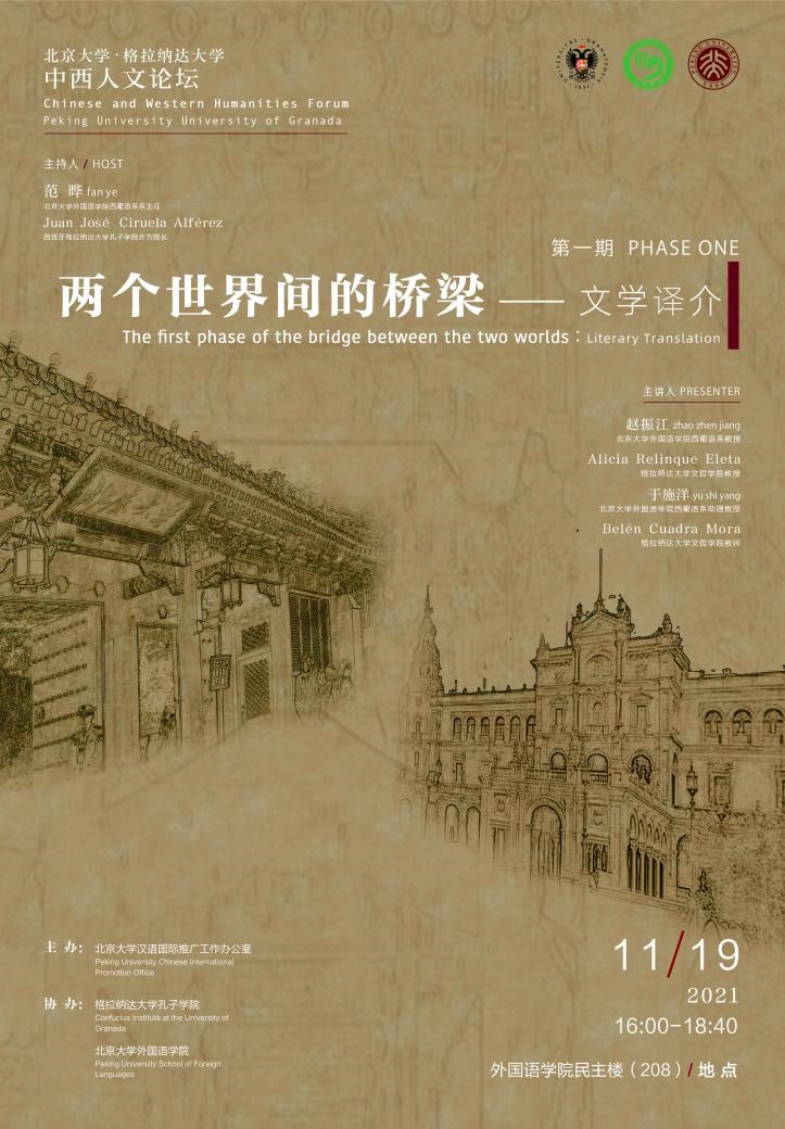 2021年11月19日,由北京大学汉语国际推广工作办公室主办(以下简称汉推办),西班牙格拉纳达大学孔子学院与乐鱼·体育协办的首期“中西人文论坛”在民主楼208会议室成功举办。本期论坛以“文学译介-两个世界间的桥梁”为主题,邀请来自乐鱼·体育西葡意语系教授赵振江、系主任范晔、副系主任于施洋,格拉纳达大学文哲学院教授、汉学家雷林克(Alicia Relinque Eleta)、西班牙中国文学作品新生代译者代表白兰(Belén Cuadra Mora),格拉纳达大学孔子学院外方院长胡安·何塞·西鲁埃拉(Juan José Ciruela)为国内外通过网络连线论坛的百余名师生带来精彩的讲座。本次论坛由范晔与胡安共同主持。