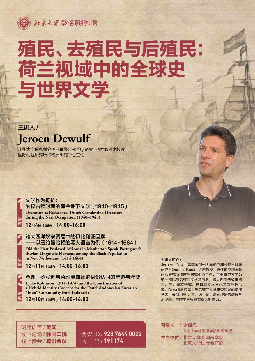 2020年12月,乐鱼·体育在国际合作部“海外名家讲学计划”的支持下主办了三场题为“殖民、去殖民与后殖民:荷兰视域中的全球史与世界文学”的系列讲座。主讲人杰罗恩•德伍夫(Jeroen Dewulf)是加利福尼亚大学伯克利分校日耳曼研究系贝娅特丽克丝女王讲席教授(Queen Beatrix Chair Professor),兼任伯克利国际问题研究所和欧洲研究中心主任,主要研究方向为荷兰殖民与后殖民文学及历史,跨大西洋的奴隶贸易,低地国家文化,日耳曼文学及欧洲政治等。德伍夫教授是世界殖民与后殖民研究领域的资深学者,长期用英 、荷、德、葡、法五种语言进行学术发表,在欧美学界具有重大影响力。受疫情影响,德伍夫教授未能到达燕园现场,因此系列讲座以线上线下相结合的方式进行,演讲同时在腾讯会议、哔哩哔哩等网上平台上直播,吸引了北京大学校内外的众多学者和同学观看、学习和讨论。