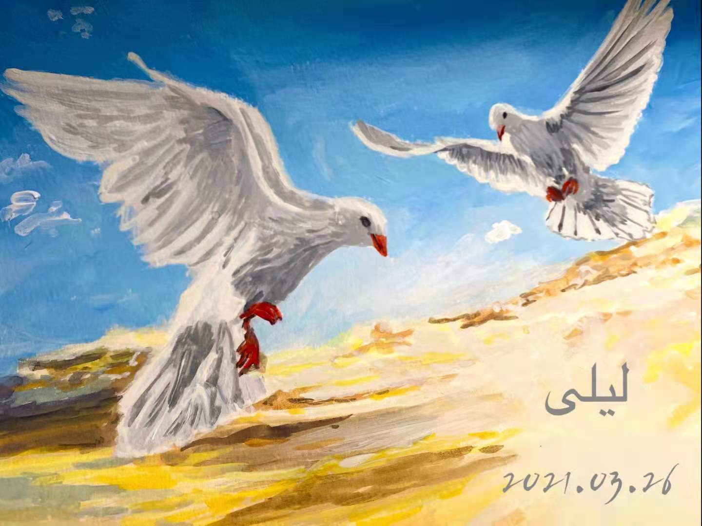 经过一星期的刻苦练习,3月26日下午,歌曲录制正式开始。“我们的心跳重新获得生命的活力,我们的脸庞将焕发光彩并点亮这长夜的黑暗”,从外文楼前的海棠树下,到未名湖中的石舫之上,阿语班的同学们将和平之声唱响整个校园。同学们的歌声是真情的流露,是热切的期盼,“我们的歌声虽然渺小,但也代表了我们对于和平的向往,希望可以为和平之路上洒上一些微光。”万毅成同学说。除了录制歌曲之外,同学们分别以阿文书法和绘画的形式表达了对叙利亚儿童、对叙利亚人民的美好祝愿,王心怡同学画下了飞向叙利亚朝霞的和平鸽,许政哲和王笛同学则用阿语写下了“愿叙利亚的孩子们被温柔以待”;同学们还纷纷用阿语呼喊出了自己内心对和平的希望:“我衷心地希望可爱的叙利亚的孩子们早日回归和平美好的生活”“我真诚地祝愿叙利亚早日恢复和平,祝愿叙利亚人民安康快乐”……