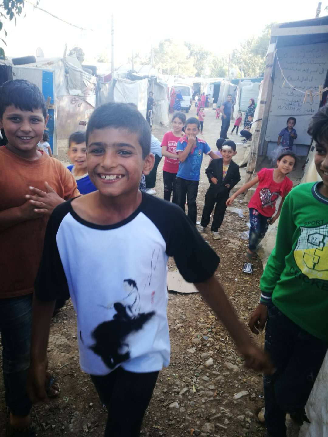 难民营儿童穿上“走进中东”活动赠送的中国水墨文化衫