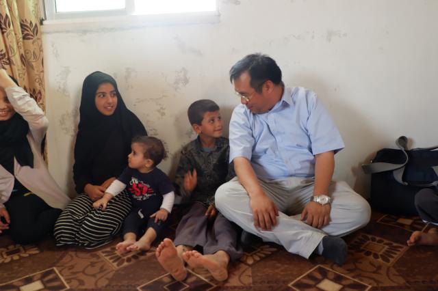 “走进中东”调研活动中,吴冰冰老师与难民营儿童交谈了解生活状况