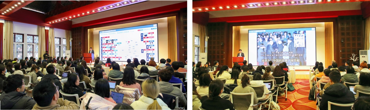 来自松下卓越运营中国东北亚公司副总裁赵炳弟先生、政府及公共关系副总监徐海波先生、松下纪念馆馆长尹晓薇女士、人力资源中心副总监蒲彤蕾女士及政府及公共关系部副总监金冬梅女士陪同本间哲朗副总裁一同来访。北京大学社会科学学部部长、国际关系学院亚非研究所所长初晓波教授,北京大学经济学院汪婉教授,乐鱼·体育党委书记李淑静教授以及国际关系学院、乐鱼·体育和经济学院的学生参加了此次讲座。讲座由乐鱼·体育日语系主任孙建军长聘副教授主持。