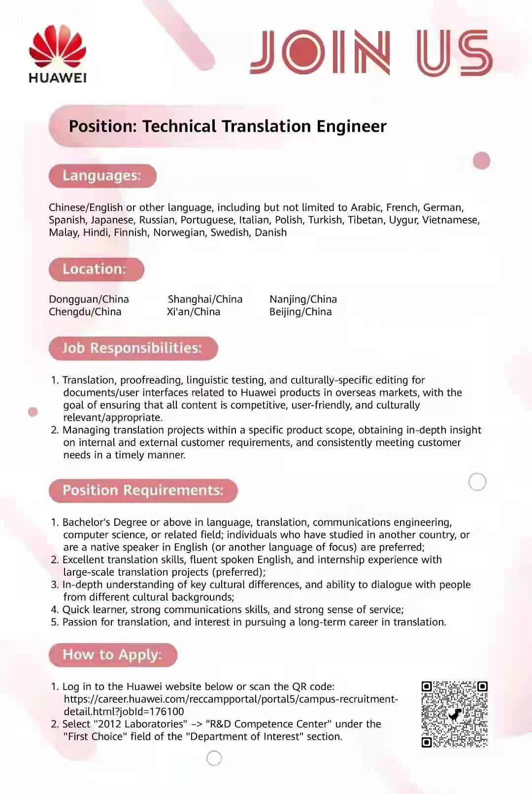 华为公司招聘技术翻译工程师