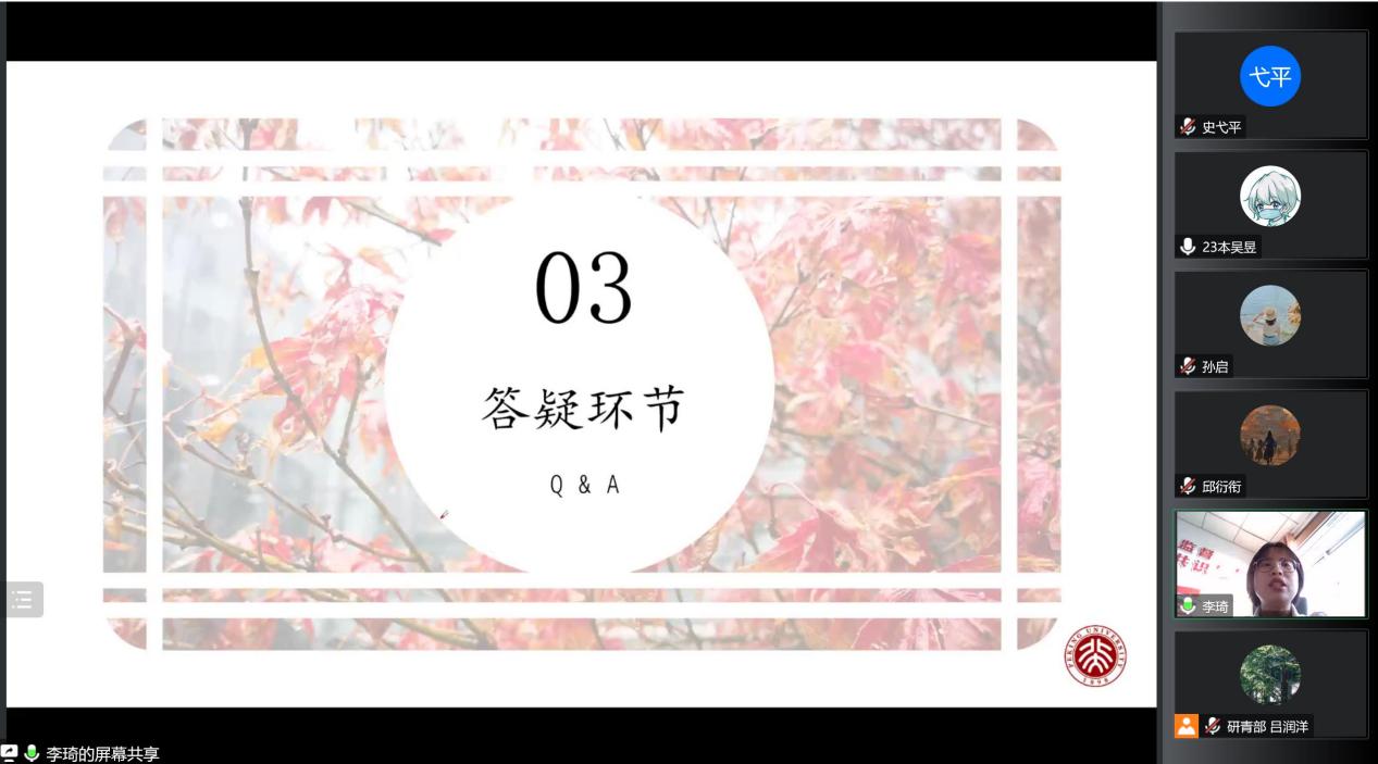 孙启校友从报考选调生的动机谈起,希望各位同学端正入党动机,保持参与选调的初心,把个人的理想追求融入党和国家事业之中,为党为祖国为人民多作贡献。随后孙启从信息搜集、报考资格的获取、报名、笔试备考、面试备考、政审和体检等方面介绍中央选调的选拔流程,并且分享自己入职统战部以后的体验和心路历程。孙启建议大家:“风物长宜放眼量,在学习、工作或生活当中遇到不如意的时候,其实可以把眼光放长远一些,尽量保持开阔的心胸,这样才能实现长期向上的稳定发展。”