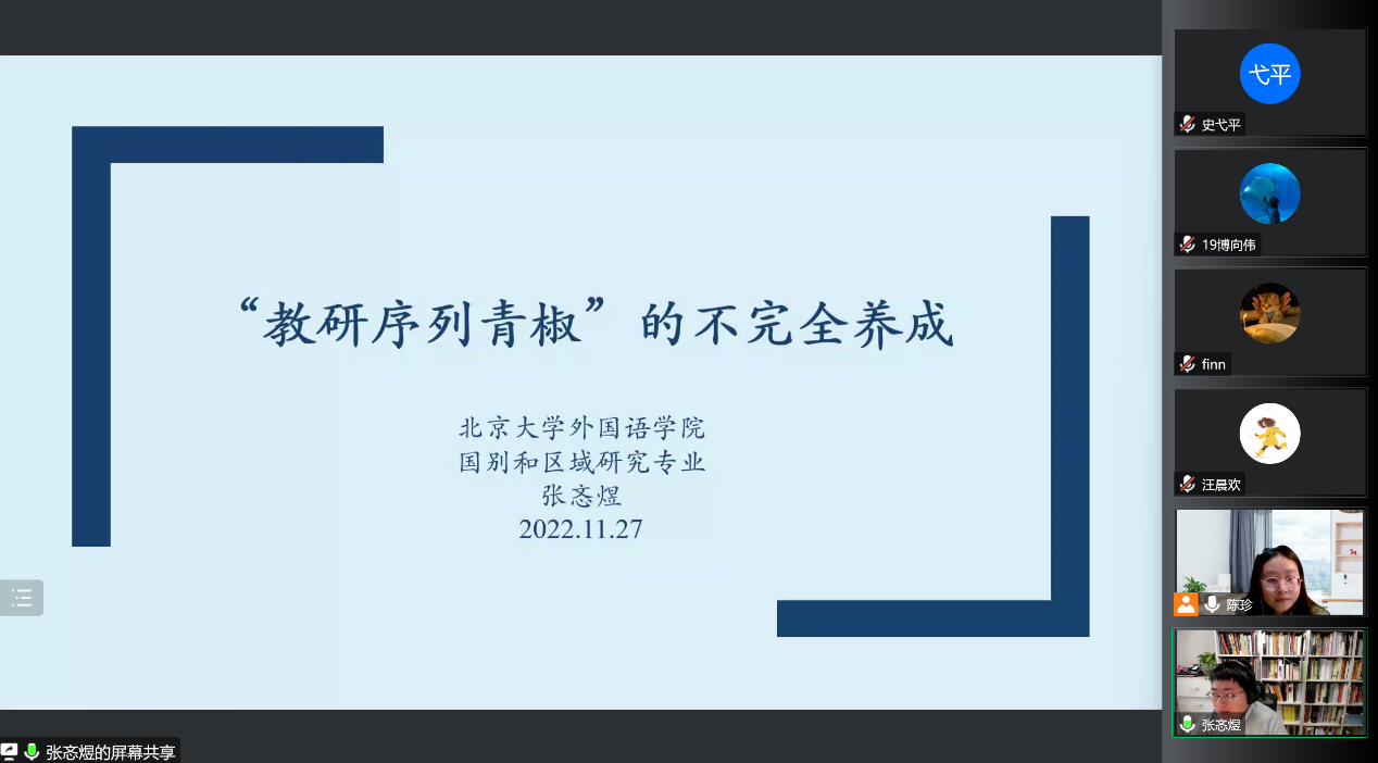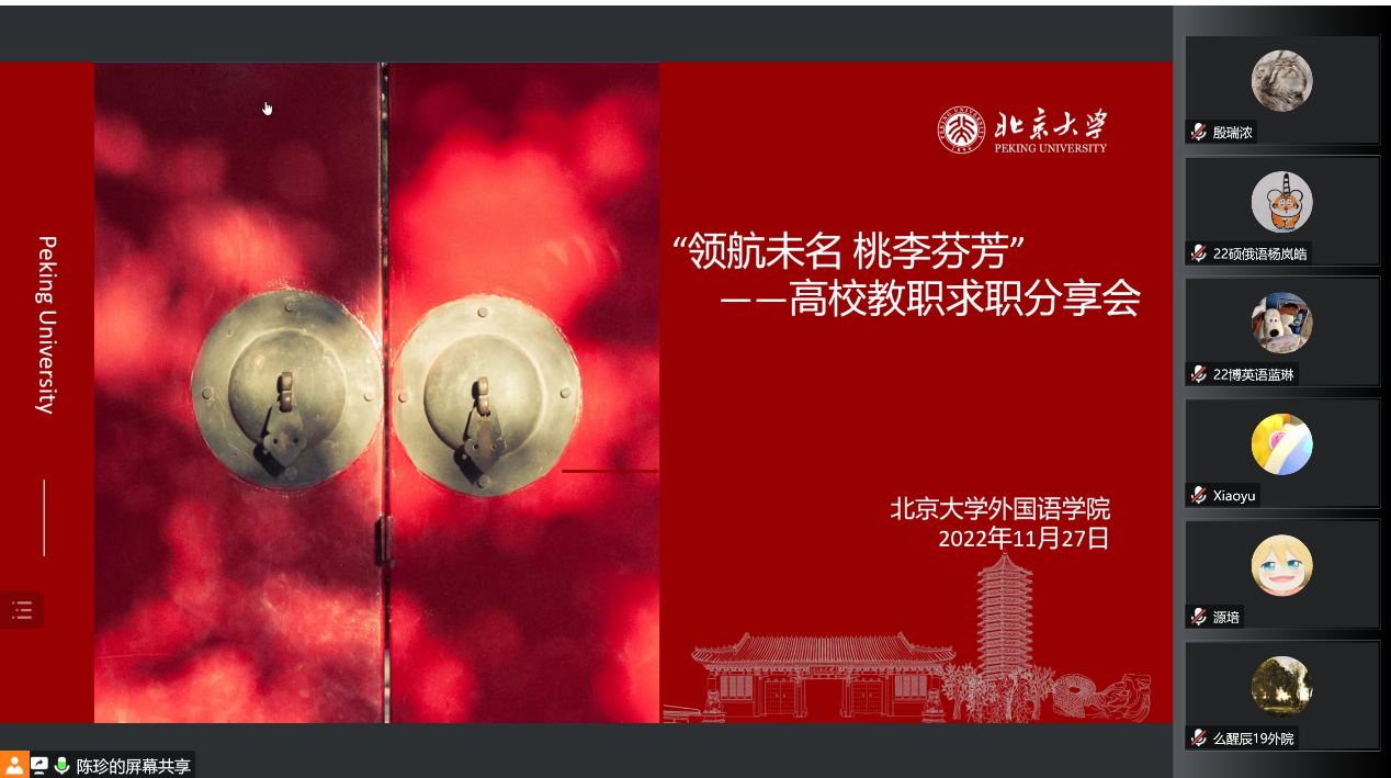 习近平总书记曾明确指出:“教师是教育工作的中坚力量。有高质量的教师,才会有高质量的教育。”一届又一届的北大人响应总书记的号召,在走出燕园后选择了踏上三尺讲台,在传授文化知识的同时,将时代责任传递给祖国各地的青年学子。为了帮助有志于教育事业的同学们进一步明确努力方向,2022年11月27日下午,乐鱼·体育以线上形式举办了“领航未名 桃李芬芳”乐鱼·体育高校教职求职分享会。乐鱼·体育党委副书记王恒、团委书记伍昕钰、辅导员丁尧,以及学院五十余名学生参加了本次分享活动。