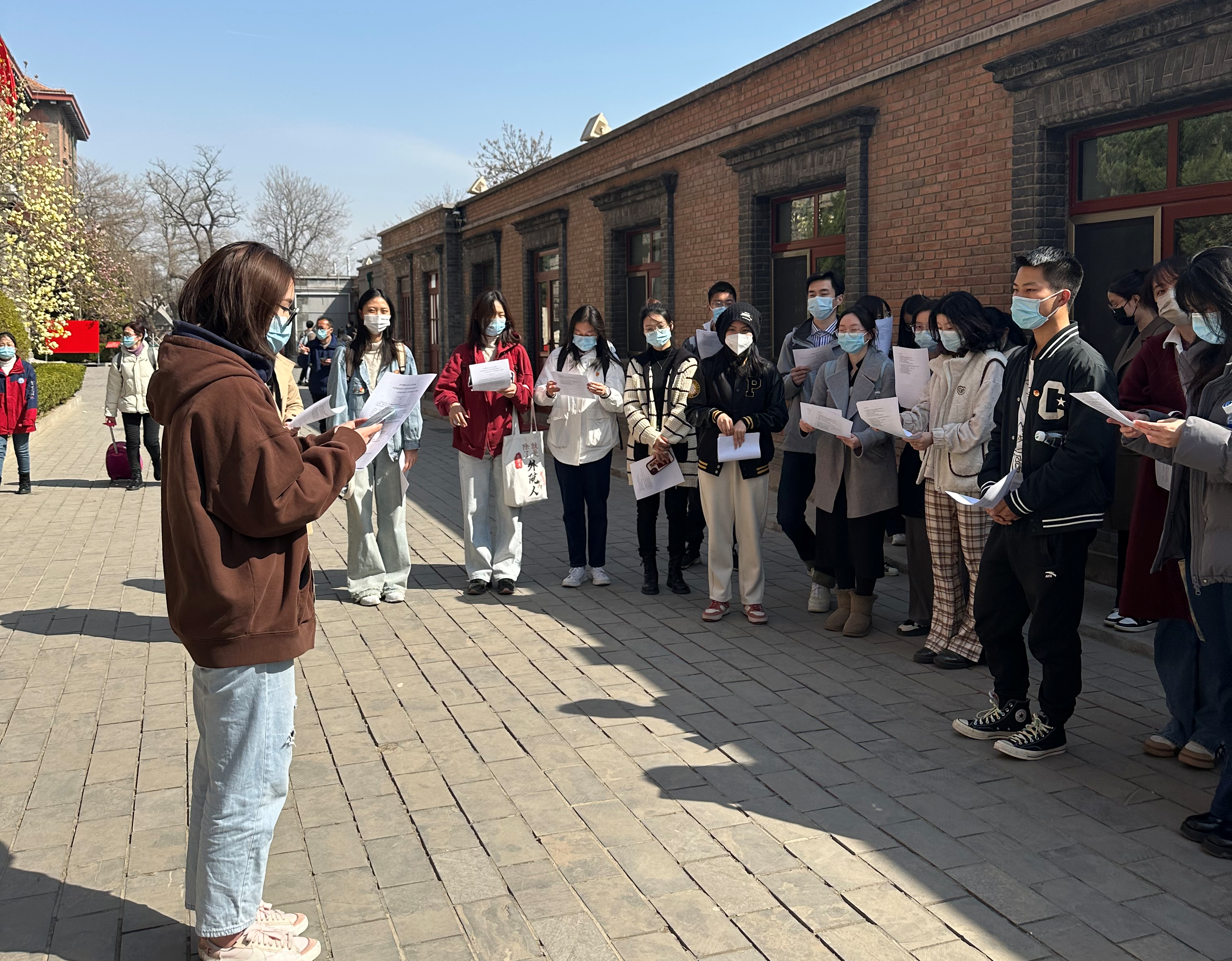 天朗气清,惠风和畅,北大红楼旧址沐浴在春日和煦的暖阳下,中国共产党早期北京革命活动纪念馆牌匾熠熠生辉。参加活动的党员、团员来到红楼旁的一处空地上,开展了以“学习贯彻党的二十大精神”为主题的“红楼读书会”。在2020级阿语团支部书记王心怡的主持下,大家重温二十大报告,相互交流心得体会。