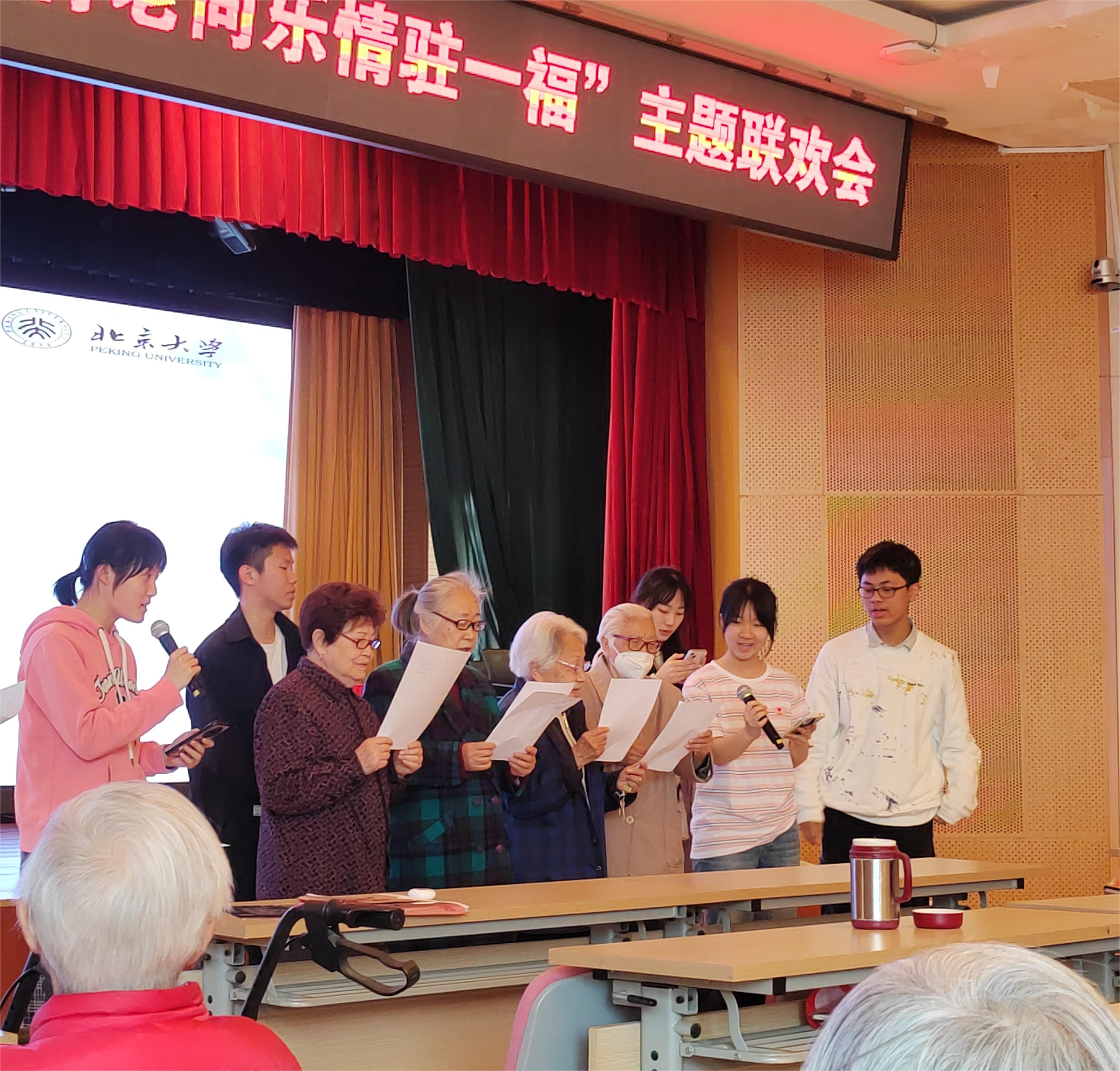 “青老同乐”,穿插在节目之间有趣的互动环节是必不可少的。英语班的志愿者们带着老人们共唱“Yesterday once more”,充满温情的旋律和令人动容的歌词将大家的心紧紧联系在一起;诗词班志愿者们组织的“我爱记诗词”则以“诗词问答”的方式和老人们一同回顾了所学的诗词,志愿者们的循循善诱和老人们抑扬顿挫的背诵也相互响应,轻松和乐。