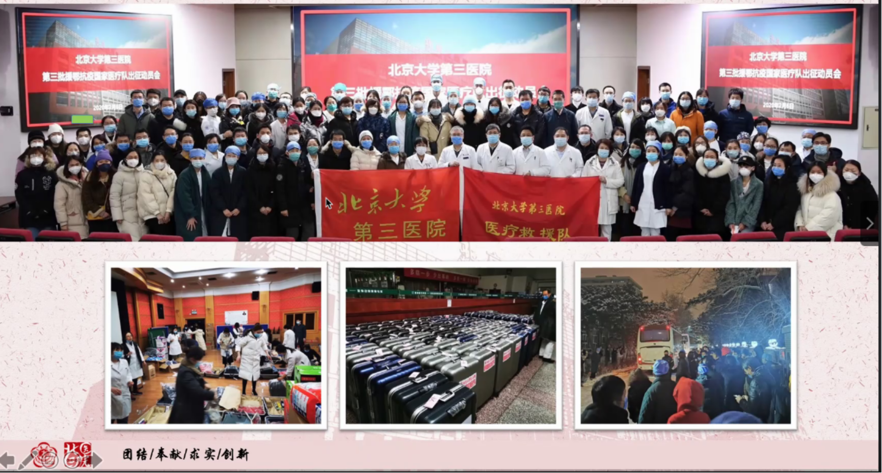 公开课上,庄昱老师首先和大家分享了他在支援武汉期间的经历。他是援鄂医疗队管理组的副组长,参与在武汉所有工作的后勤保障、活动安排。北京大学医疗队共派出了三批队员,从探索救治模式、创建危重症隔离病房样板,到复制成功经验与模式、扩展新病房,再到救治手段和组织形式不断成熟、独立整建制运行病房,这期间医院的院长领导、经验丰富的医生和年轻小队员在武汉并肩作战,克服了许多困难。