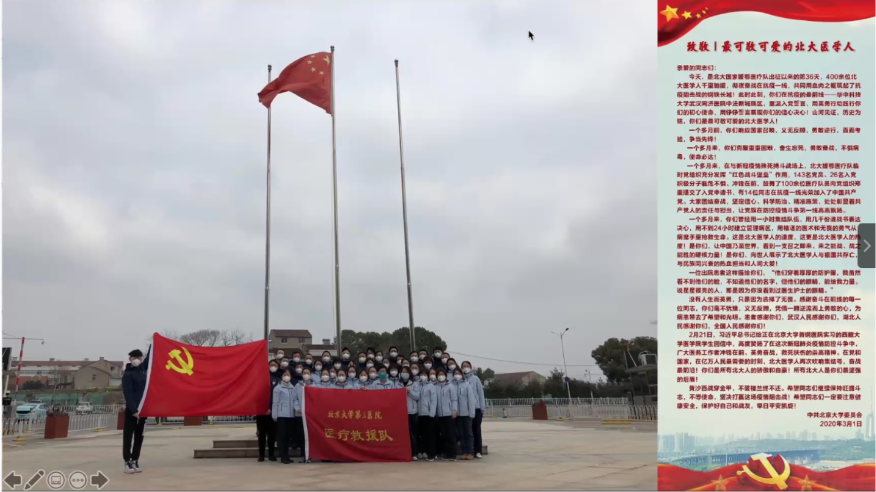6月23日晚,乐鱼·体育通过线上的方式举办了“回归·未来”乐鱼·体育2020年毕业季主题活动,给毕业生们上了毕业的最后一节公开课。会上特别邀请到北京大学援鄂医疗队“90后”党员代表、北医三院医务处庄昱老师分享他在援鄂期间的经历,以及习总书记回信背后的故事。乐鱼·体育党委书记李淑静老师、党委副书记王恒老师,以及毕业年级、非毕业年级的同学们共同参加了此次活动。活动由乐鱼·体育团委书记卢敏老师主持。