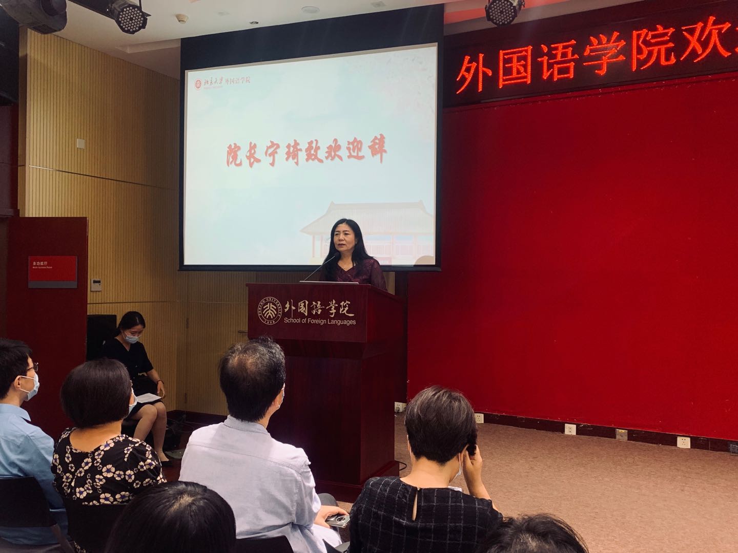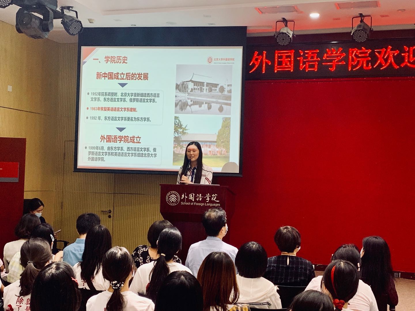 李淑静在讲话中表示,青年是人生的关键期,她希望新生们能在本科四年时光中找到人生理想、事业方向、良师益友。同时,她向同学们送上迎新寄语:一是希望大家珍惜时间,投身多彩校园生活,培养有益于身心发展的业余爱好;二是希望大家学会学习、学会生活、学会爱党爱国爱校爱院,成长为懂自己、懂学院、懂学校、懂中国、懂世界的北大人,争做“爱国、励志、求真、力行”的时代新人;三是希望大家不忘“团结起来,振兴中华”的初心,牢记“世界在我脚下,祖国在我心中”的外院人使命。