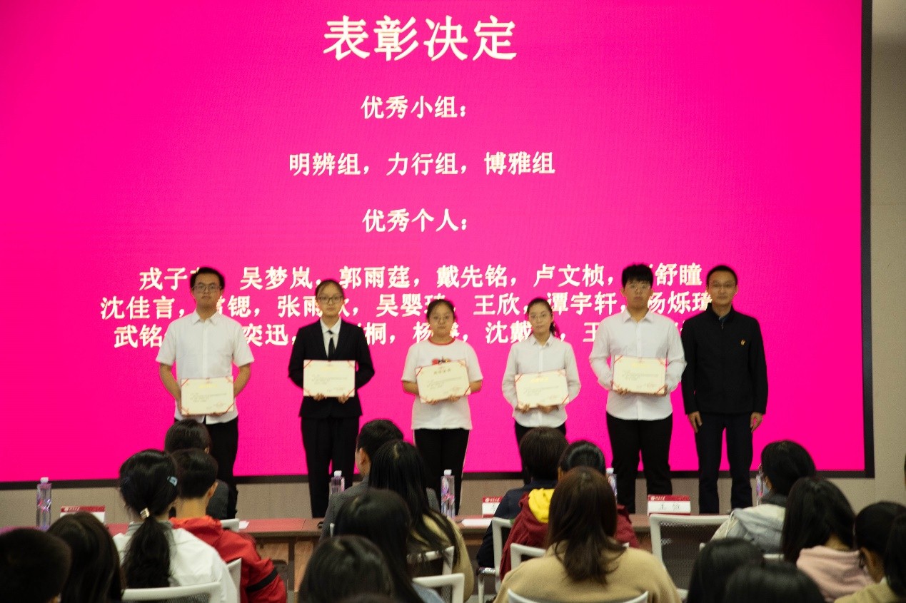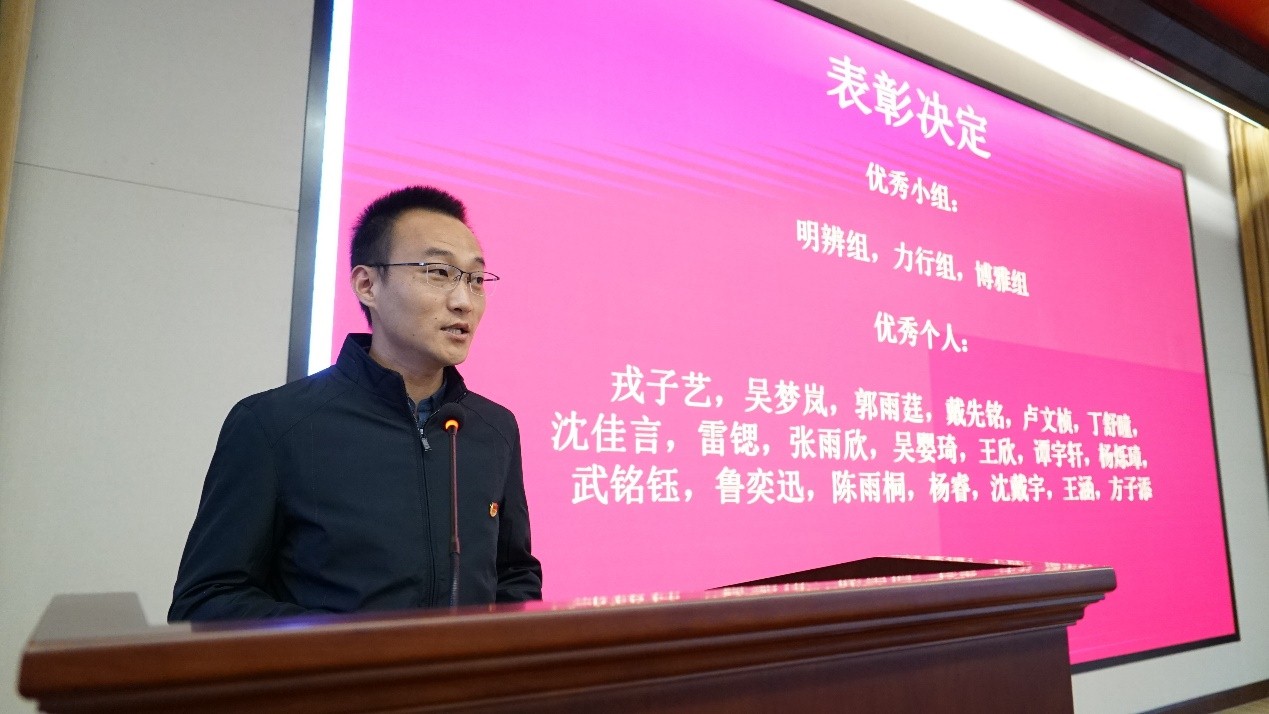 王恒老师宣读对上一年团校表现突出的个人和集体进行表彰的决定,希望大家再接再厉,争当“有理想、有本领、有担当”的一代,并期待新一期团校学员能受表彰的个人和集体为榜样,展示外院学子的独特风采。