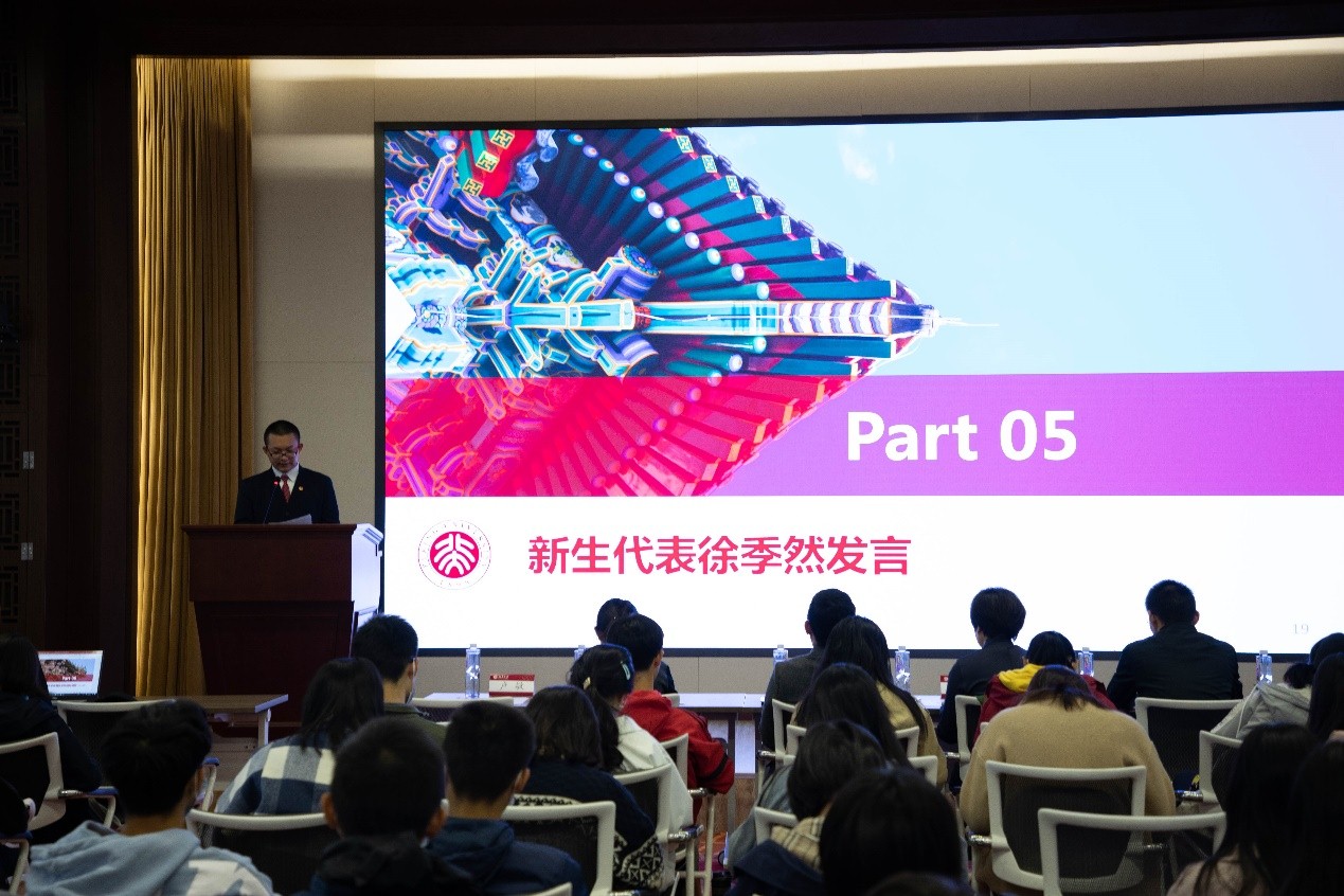 2020级本科生徐季然代表新学年团校学员发言。他表示,2020年初的疫情让青年人看到了中国特色社会主义制度的强大优势,更让大家明确了时代赋予青年的重大使命。他希望能与各位同窗一道,在外院团校深入学习先进理论、把握正确方向、提升自身能力、躬行时代担当。徐季然表示,作为外院学生骨干的后备力量,在接下来的学习生活中他也将发挥“骨干”作用,积极为同学服务,不忘初心,严于律己,力求知行合一。