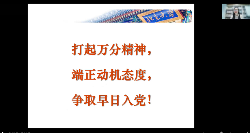 在首先进行的“党委书记讲党课”环节中,李淑静老师以“如何成为一名优秀的共产党员”为题,结合自己三次亲身参与国庆游行和今年见证建党百年华诞活动的亲身经历,以及身边具有代表性的先锋模范共产党员师生的突出事迹与表现,深入浅出地向大家讲解了优秀共产党员应当具备的特质品质。在燕园学习、工作、浸润的三十八年间,李淑静老师实现了从学生到教研一线教师再到教学、行政“两手抓”的党政干部的身份转变,褪去了往日的懵懂与青涩,收获了成长与从容;以党和国家的发展引导自身进步,又将个人的进步融于党和国家的发展,真正践行了心系祖国、心怀天下的家国情怀,并用自己的切身感悟影响了一代又一代的青年学生。
