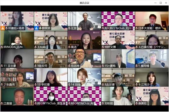本届“永旺杯”采用线上会议的比赛模式,邀请校内外的日语专家们出席并担任嘉宾及评委。日本国驻华大使馆公关文化中心二等秘书樱井真一、公益财团法人永旺1%俱乐部事务局次长石川忠彦、永旺商业有限公司总经理入野田润、北京大学教育基金会项目管理部部长禹洁、乐鱼·体育日本语言文化系副教授王京、助理教授岳远坤、王灿娟出席本次比赛。