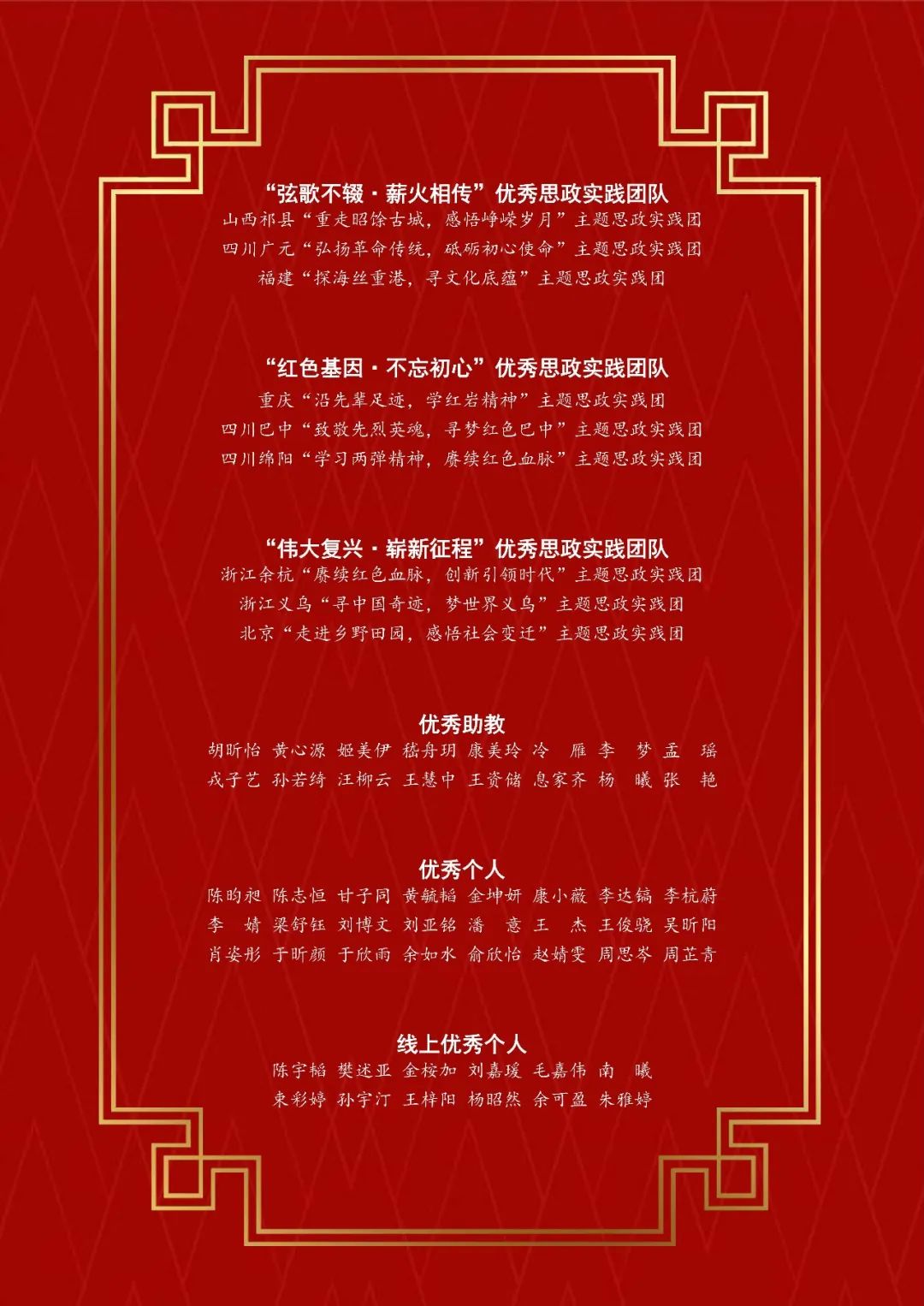 各思政实践课程团队都紧扣实践主题,深入祖国基层,探寻城市历史,感受红色基因,更加增进了对国家发展战略的理解,坚定了北大外院青年的理想信念,也为今后思政实践课程活动的开展提供了宝贵思路。