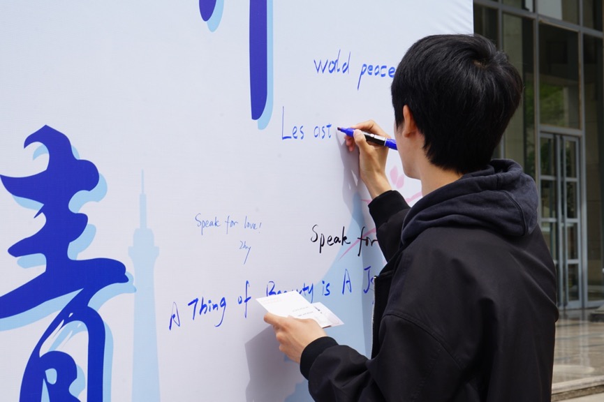 趣味十足的活动以互动化的形式、沉浸式的体验,吸引了各国语言文化爱好者前来,他们在工作人员和志愿者的协助引导下,纷纷在主题展板上留言,在交流互动中感受着不同国家语言的魅力。