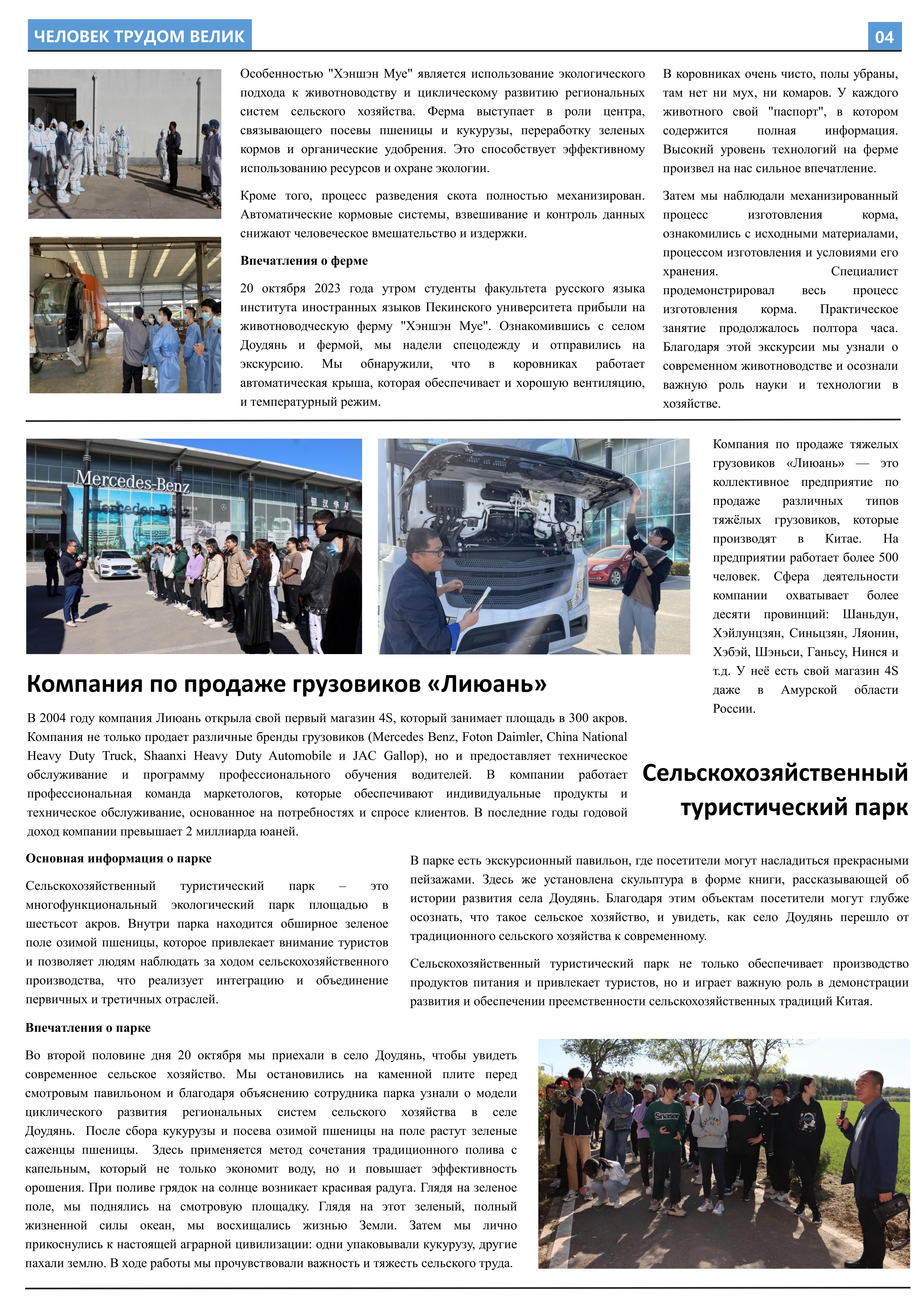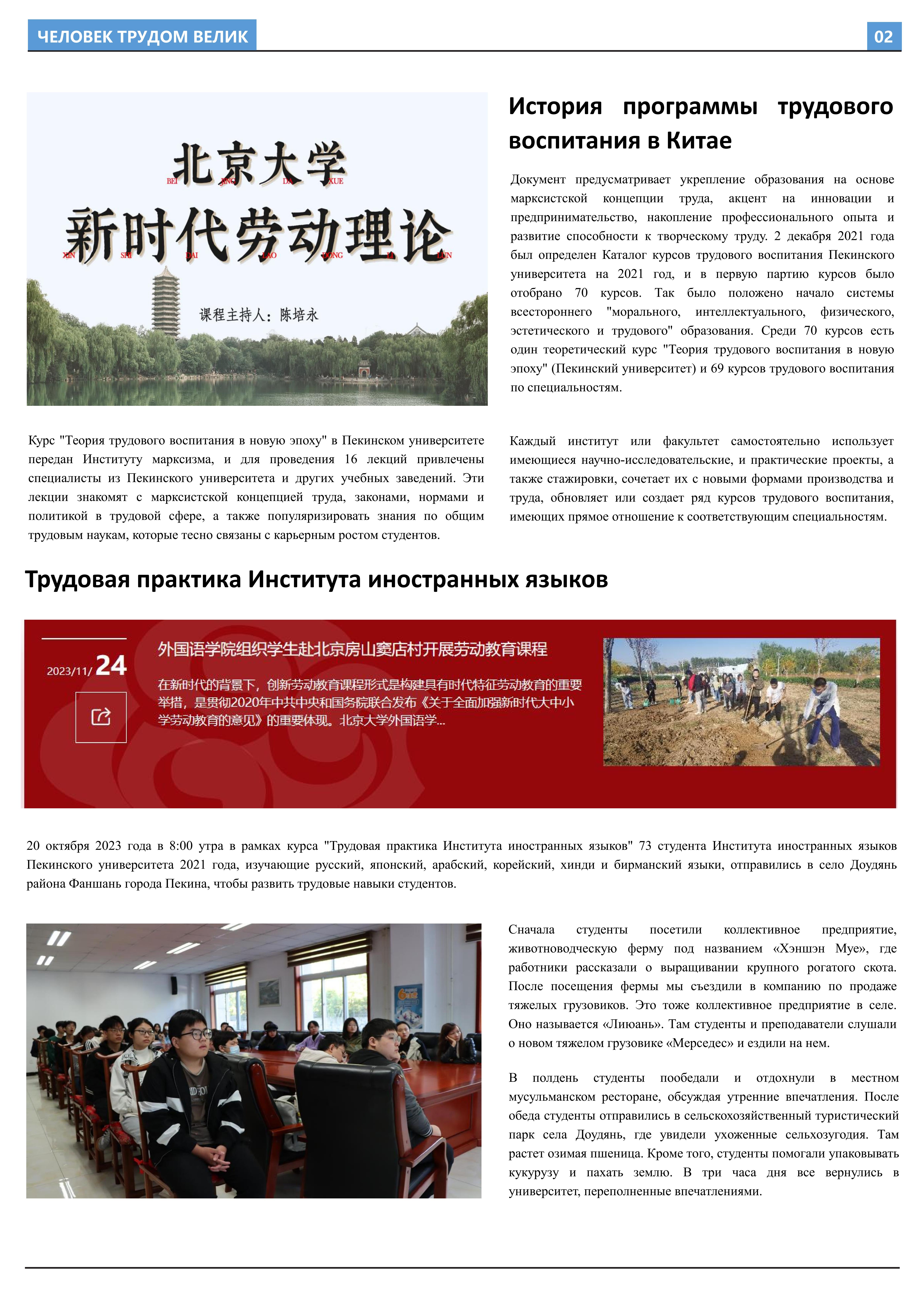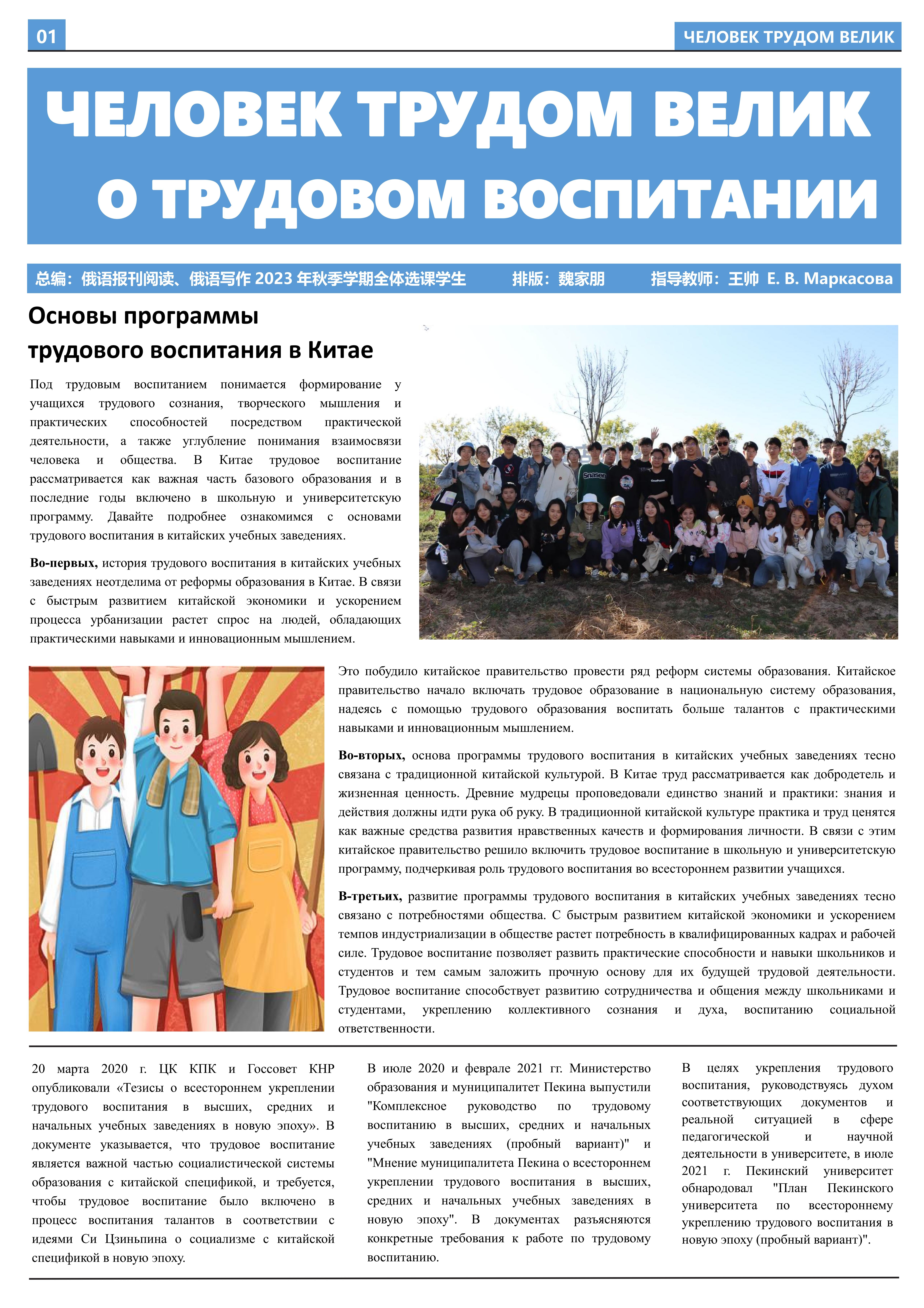 在接受劳动教育、参与劳动实践后,2023年10月至2023年12月,乐鱼·体育2021级俄语本科生班的11名同学立足于学院平台和专业课堂(《俄语报刊阅读(上)》与《俄语写作(上)》),在两位课程主讲教师王帅和外教叶莲娜·马尔卡索娃(Елена Маркасова)的指导下,通过线上分工、小组讨论等形式商讨报纸细节,并学习使用重要概念和关键词句的俄语表达,历时近三个月,共同完成6个版面、3000余个单词数的“劳动成就人——关于劳动教育”主题报纸。报纸共分为8个大主题、13个小主题,全面介绍了乐鱼·体育劳动教育课程的实施背景及学生参与情况,系统阐述了窦店村的历史文化与经济发展等多方面内容,并详细记录了同学们在窦店村恒升牧业畜牧养殖中心、窦店利元车业、农业观光园等劳动教学点的劳动实践与参访感受。