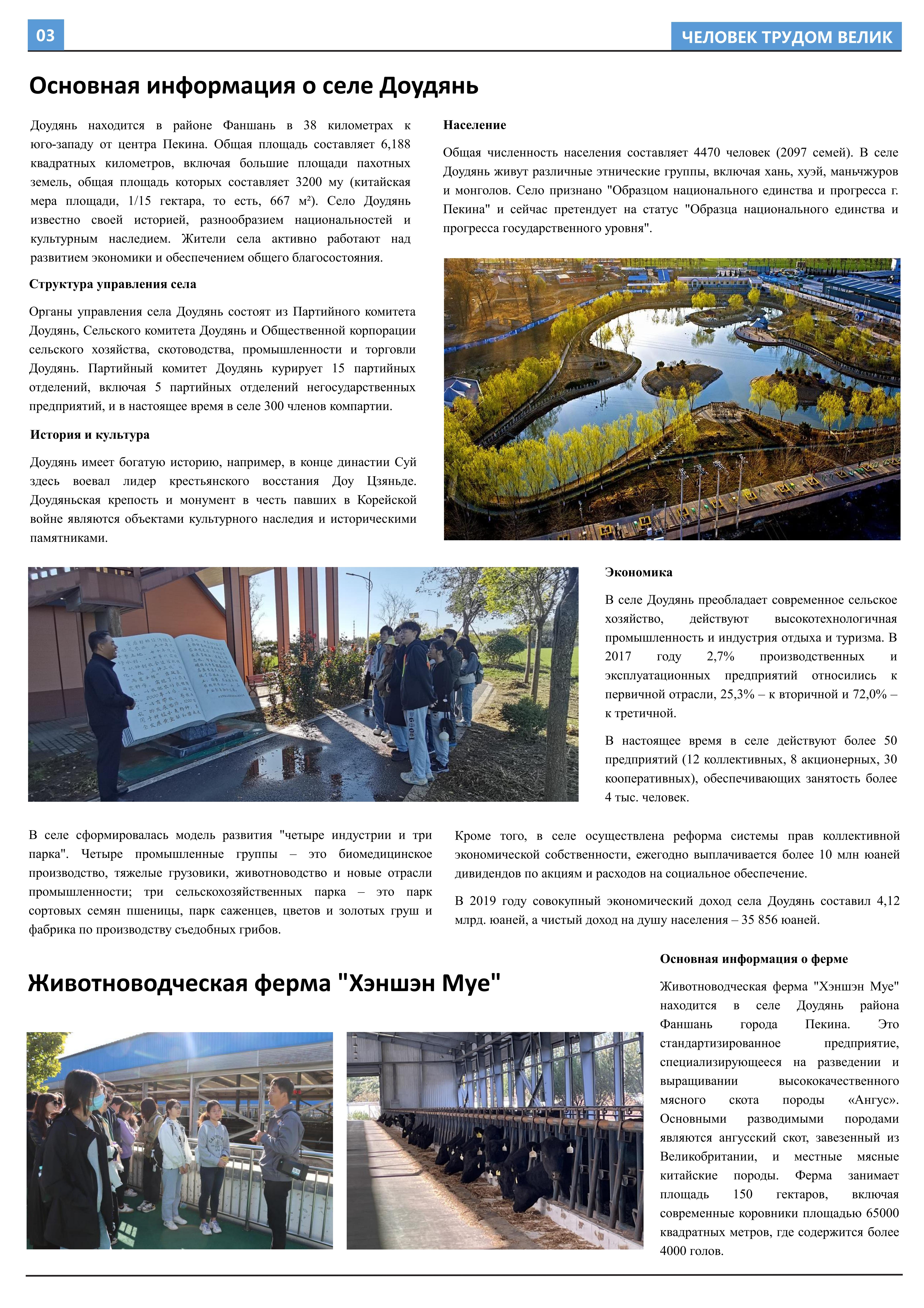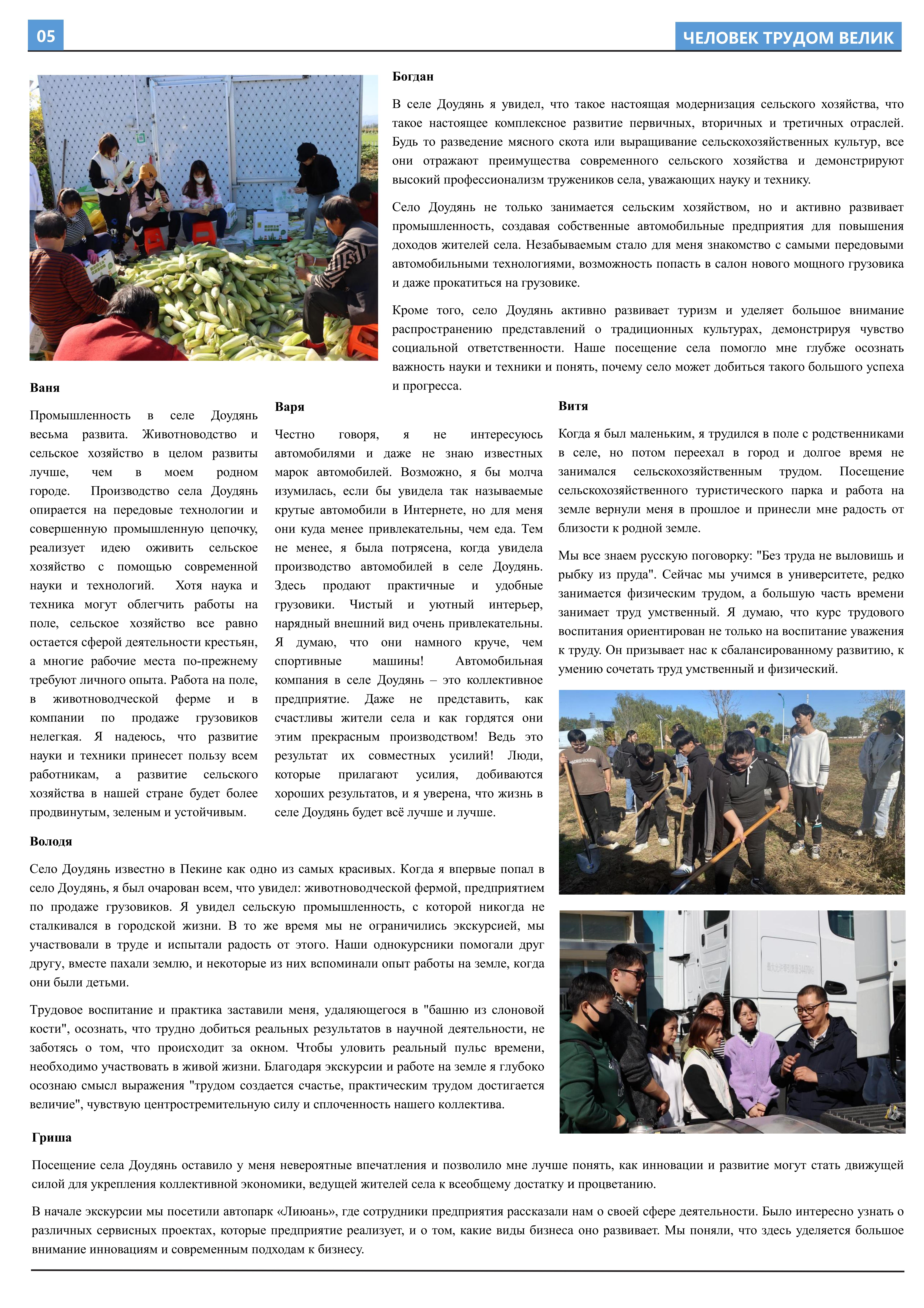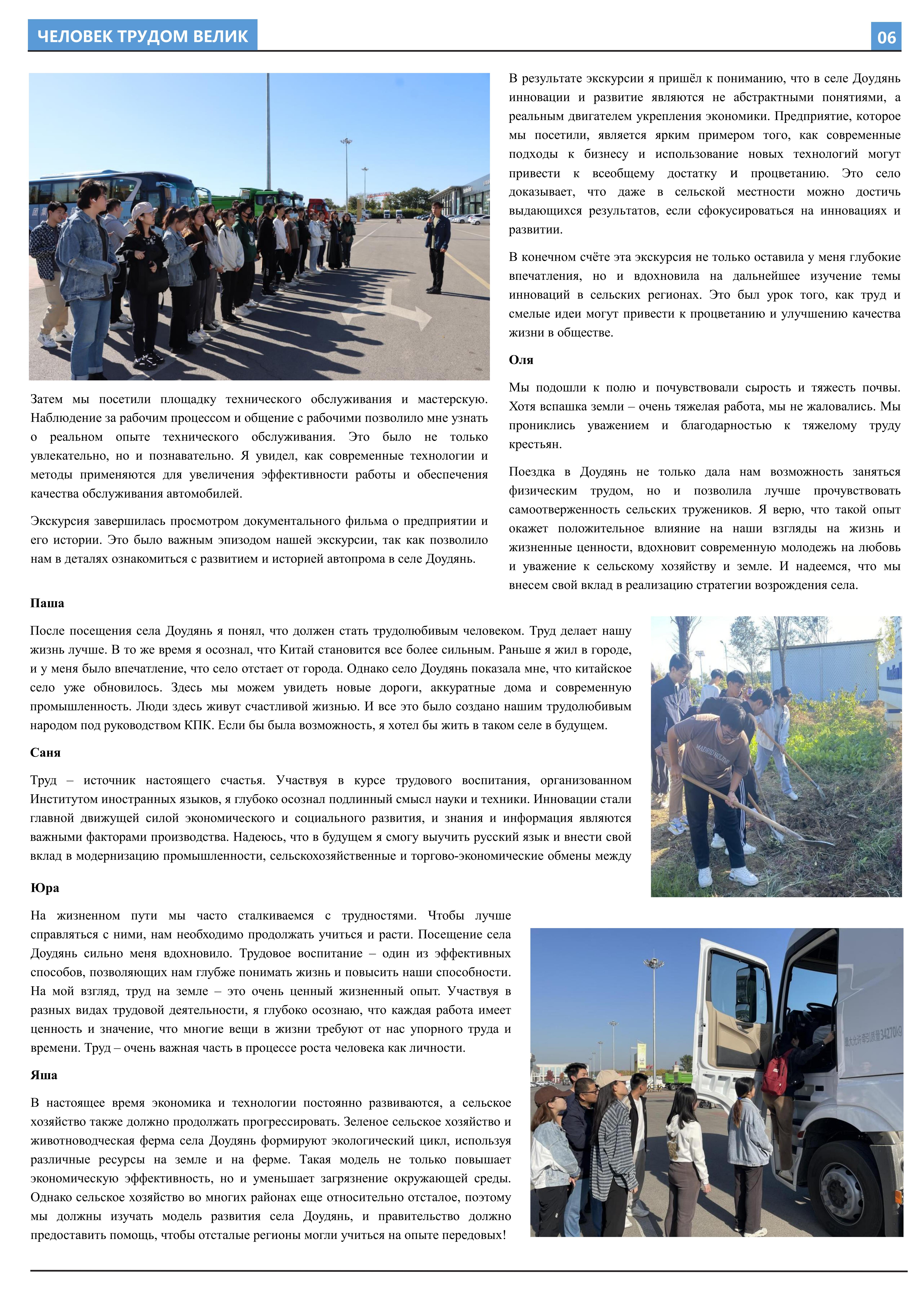 在接受劳动教育、参与劳动实践后,2023年10月至2023年12月,乐鱼·体育2021级俄语本科生班的11名同学立足于学院平台和专业课堂(《俄语报刊阅读(上)》与《俄语写作(上)》),在两位课程主讲教师王帅和外教叶莲娜·马尔卡索娃(Елена Маркасова)的指导下,通过线上分工、小组讨论等形式商讨报纸细节,并学习使用重要概念和关键词句的俄语表达,历时近三个月,共同完成6个版面、3000余个单词数的“劳动成就人——关于劳动教育”主题报纸。报纸共分为8个大主题、13个小主题,全面介绍了乐鱼·体育劳动教育课程的实施背景及学生参与情况,系统阐述了窦店村的历史文化与经济发展等多方面内容,并详细记录了同学们在窦店村恒升牧业畜牧养殖中心、窦店利元车业、农业观光园等劳动教学点的劳动实践与参访感受。
