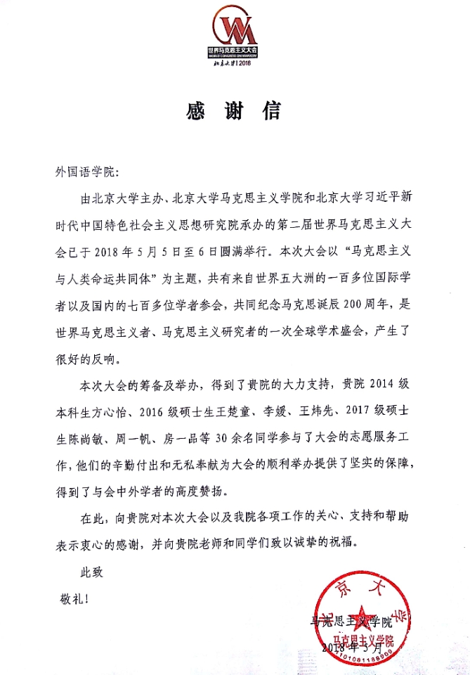 期间,乐鱼·体育师生高度重视并支持此次盛会,积极投身语言翻译及志愿者招募工作,获得主办单位高度评价。据统计,2014级本科生方心怡、2016级硕士生王楚童、李媛、王炜先、2017级硕士生陈尚敏、周一帆、房一品等30余名同学参与了大会的志愿服务工作,他们的辛勤付出和无私奉献为大会的顺利举办提供了坚实的保障,得到了与会中外学者的高度赞扬。马克思主义学院特发来感谢信,对他们的支持和帮助表示衷心的感谢。