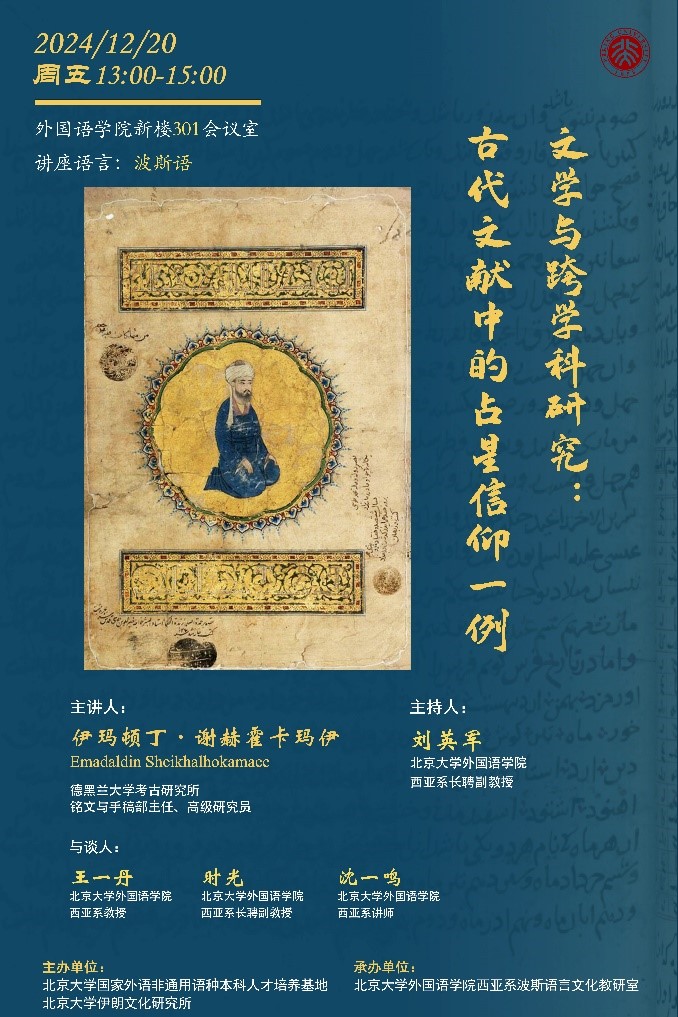 2024年12月20日,德黑兰大学考古研究所铭文与手稿部主任、高级研究员伊玛顿丁·谢赫霍卡玛伊 (Emadaldin Sheikhalhokamaee)应邀在乐鱼·体育新楼301会议室做“文学与跨学科研究:古代文献中的占星信仰一例”专题讲座。本次讲座由北京大学国家外语非通用语种本科人才培养基地,北京大学伊朗文化研究所主办,乐鱼·体育西亚系波斯语言文化教研室承办。讲座由乐鱼·体育西亚系长聘副教授刘英军主持,西亚系教授王一丹、长聘副教授时光、讲师沈一鸣与谈。到场的还有乐鱼·体育西亚系波斯语专业外教巴哈杜尔·巴盖里(Bahador Bagheri)博士、波斯语专业本科生和研究生,以及来自北京大学中文系、历史系等相关院系的师生。