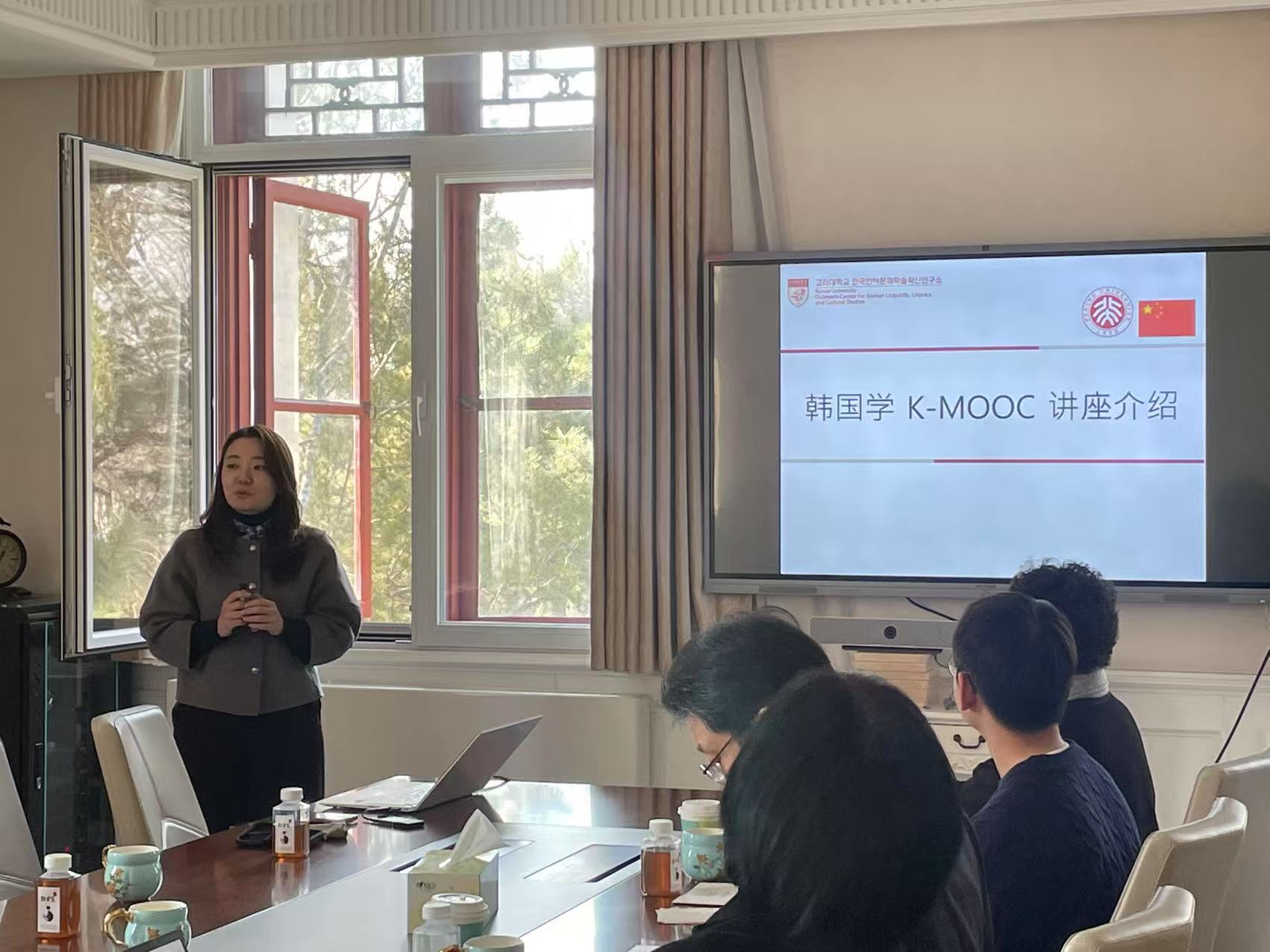 朝(韩)语系全体教师于外文楼206会议室与金钟勋教授一行进行座谈,通过座谈增进了对彼此的了解,就后续的交流与合作进行了探讨。徐晸玟老师介绍了高丽大学国际韩国语言文化研究所韩国语言文化学术传播中心自主开发的“韩国学K-MOOC线上慕课”系统,其线上课程涵盖韩国现代文学、古典文学、汉文学、韩国语教育学等多领域。