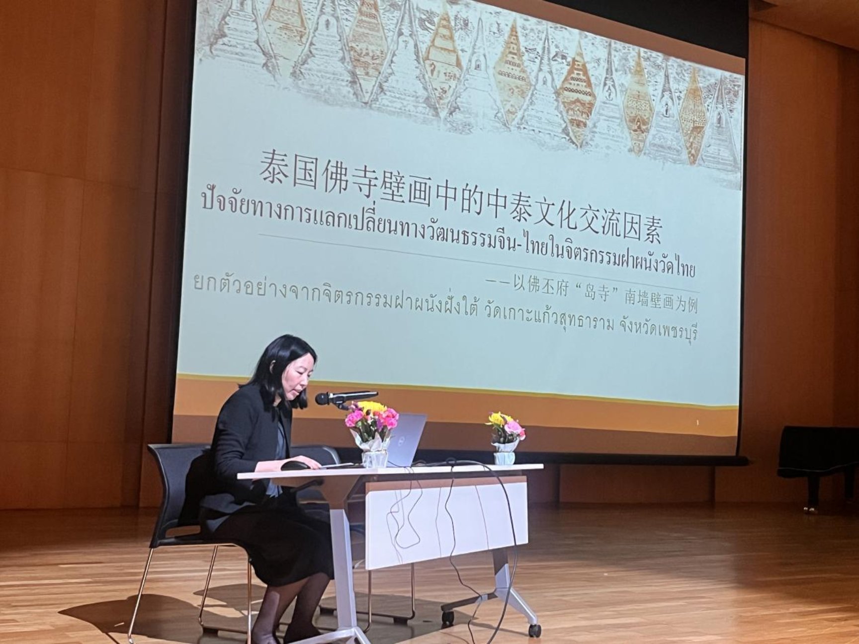研讨会分为上、下午两场,上午聚焦中泰佛教艺术交流,下午聚焦中泰佛教庙宇建筑及其信仰。泰国皇家学术院院士、泰国艺术大学荣誉教授讪迪·列素库首先做了题为“中泰艺术装饰纹样之联系”的主旨发言。接着,外院东南亚系张哲老师以“泰国佛寺壁画中的中泰文化交流因素”为题发表了最新研究成果,对泰国佛丕府宝岛寺南墙壁画进行了个案分析,强调了文化符号和宗教叙事在跨区域语境下的互动逻辑,引发了在场专家的热烈关注和讨论。艺术大学考古学院陈柳玲副教授、广州美术学院吴天跃副教授、泰国艺术大学荣若·唐容仁副教授和同济大学赵晋超助理教授分别做了题为“龙莲寺中的佛教艺术”、“10世纪吴越国的法舍利实践及其渊源”和“大佛塔:吉祥与建城之象征”和“孝行与圣王:北朝睒子本生图像叙事程式的空间性、时间性与纪念性”的主旨报告。